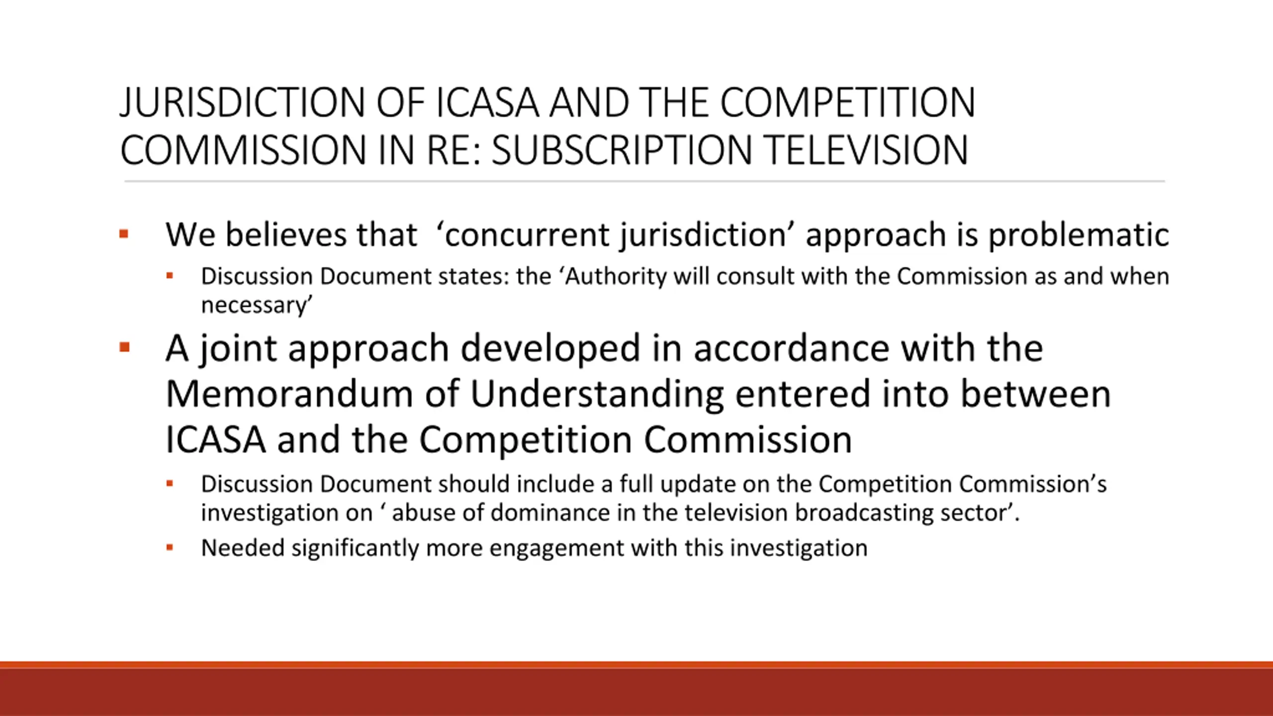 JURISDICTION OF ICASA AND THE COMPETITION COMMISSION IN RE: SUBSCRIPTION TELEVISION We believes that concurrent jurisdiction approach is problematic Discussion Document states: the Authority will consult with the Commission as and when necessary A joint approach developed in accordance with the Memorandum of Understanding entered into between ICASA and the Competition Commission Discussion Document should include a full update on the Competition Commission s investigation on abuse of dominance in the television broadcasting sector . Needed significantly more engagement with this investigation