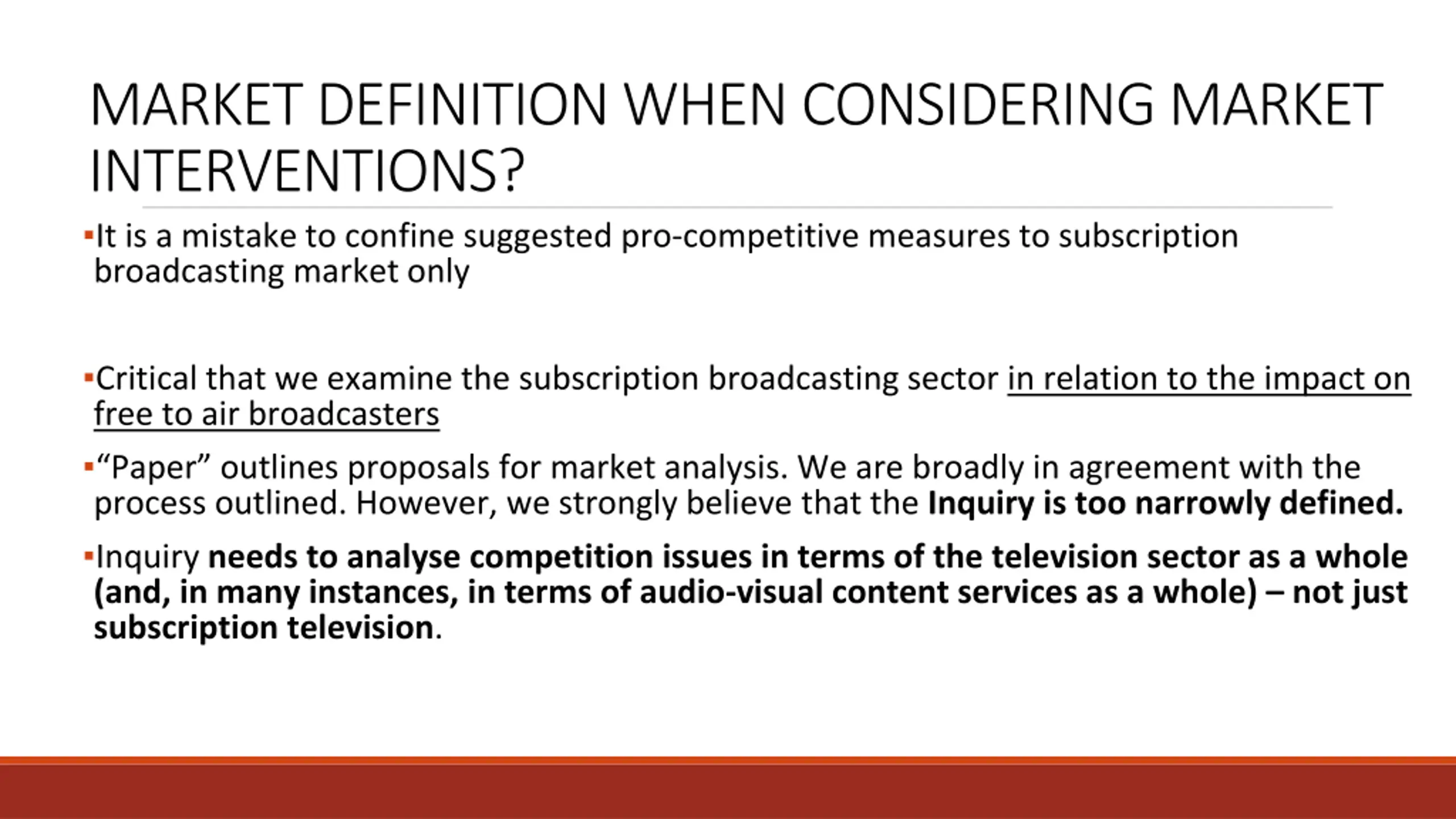 MARKET DEFINITION WHEN CONSIDERING MARKET INTERVENTIONS? It is a mistake to confine suggested pro-competitive measures to subscription broadcasting market only Critical that we examine the subscription broadcasting sector in relation to the impact on free to air broadcasters Paper outlines proposals for market analysis. We are broadly in agreement with the process outlined. However, we strongly believe that the Inquiry is too narrowly defined. Inquiry needs to analyse competition issues in terms of the television sector as a whole (and, in many instances, in terms of audio-visual content services as a whole) not just subscription television.