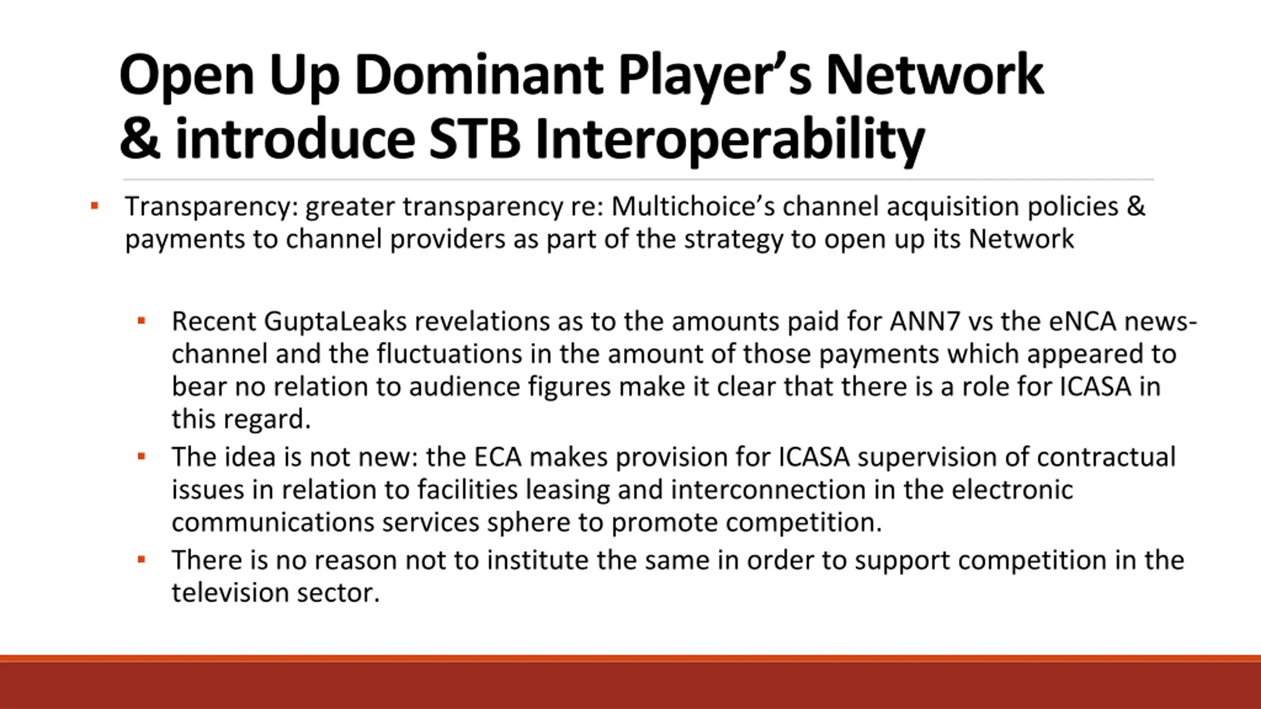 Open Up Dominant Players Network & introduce STB Interoperability Transparency: greater transparency re: Multichoice s channel acquisition policies & payments to channel providers as part of the strategy to open up its Network Recent GuptaLeaks revelations as to the amounts paid for ANN7 vs the eNCA news- channel and the fluctuations in the amount of those payments which appeared to bear no relation to audience figures make it clear that there is a role for ICASA in this regard. The idea is not new: the ECA makes provision for ICASA supervision of contractual issues in relation to facilities leasing and interconnection in the electronic communications services sphere to promote competition. There is no reason not to institute the same in order to support competition in the television sector.