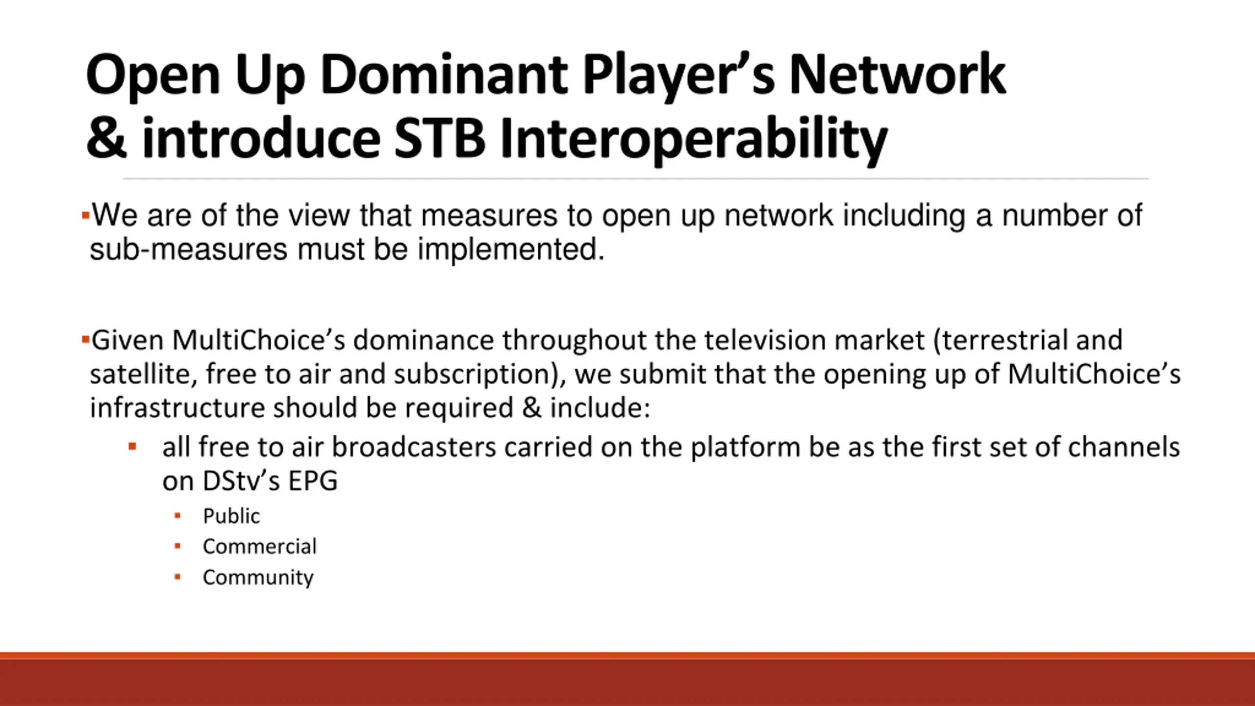 Open Up Dominant Players Network & introduce STB Interoperability We are of the view that measures to open up network including a number of sub-measures must be implemented. Given MultiChoice s dominance throughout the television market (terrestrial and satellite, free to air and subscription), we submit that the opening up of MultiChoice s infrastructure should be required & include: all free to air broadcasters carried on the platform be as the first set of channels on DStv s EPG Public Commercial Community
