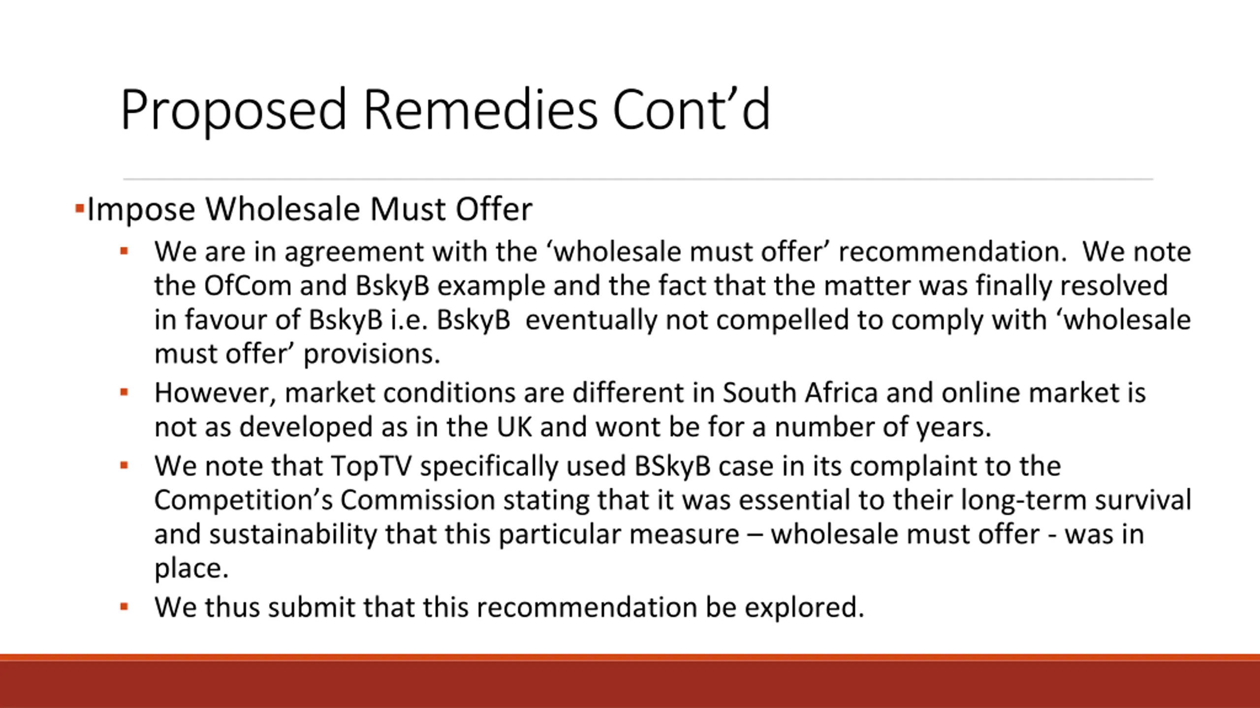 Proposed Remedies Contd Impose Wholesale Must Offer We are in agreement with the wholesale must offer recommendation. We note the OfCom and BskyB example and the fact that the matter was finally resolved in favour of BskyB i.e. BskyB eventually not compelled to comply with wholesale must offer provisions. However, market conditions are different in South Africa and online market is not as developed as in the UK and wont be for a number of years. We note that TopTV specifically used BSkyB case in its complaint to the Competition s Commission stating that it was essential to their long-term survival and sustainability that this particular measure wholesale must offer - was in place. We thus submit that this recommendation be explored.