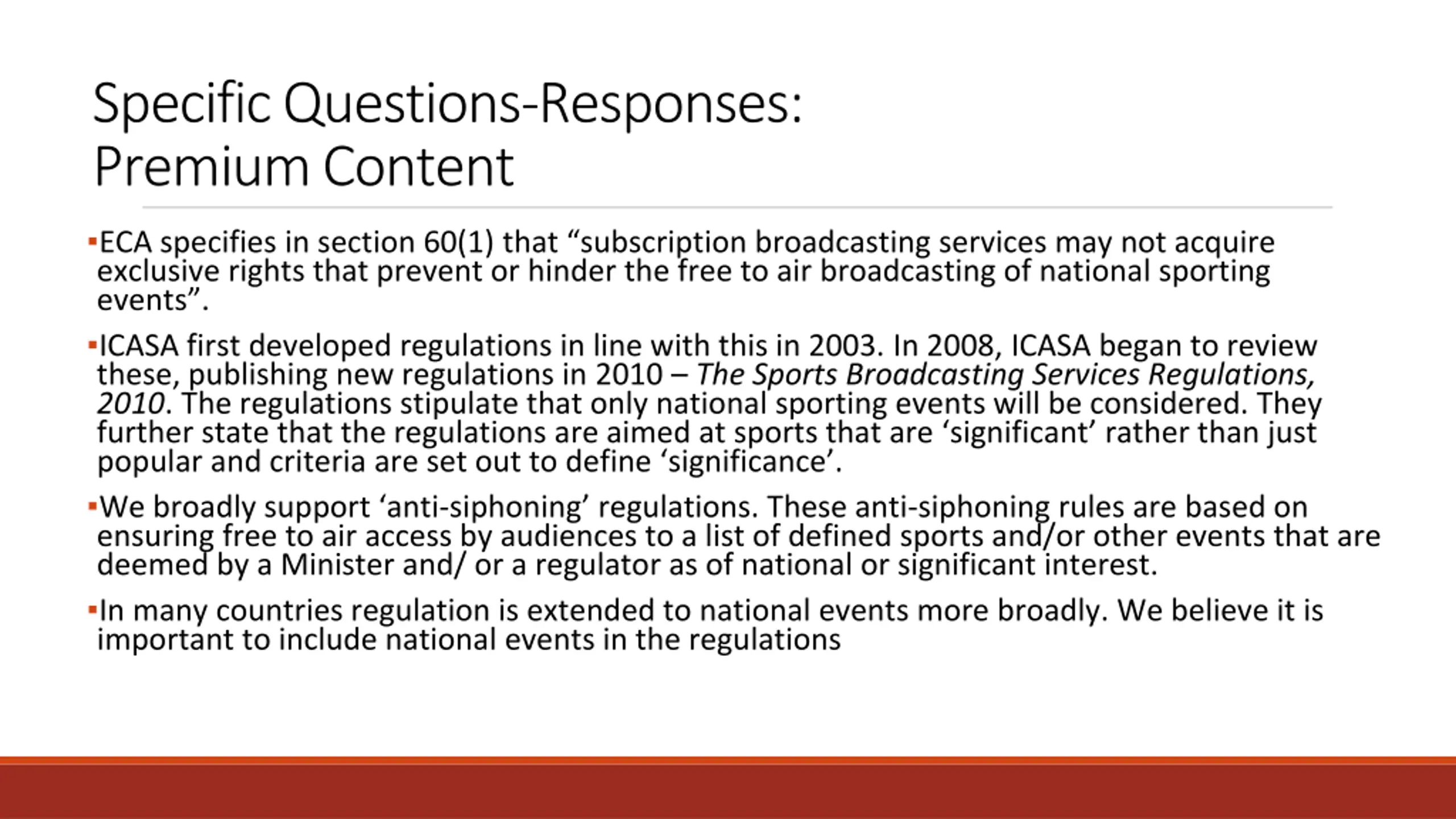 Specific Questions-Responses: Premium Content ECA specifies in section 60(1) that subscription broadcasting services may not acquire exclusive rights that prevent or hinder the free to air broadcasting of national sporting events . ICASA first developed regulations in line with this in 2003. In 2008, ICASA began to review these, publishing new regulations in 2010 The Sports Broadcasting Services Regulations, 2010. The regulations stipulate that only national sporting events will be considered. They further state that the regulations are aimed at sports that are significant rather than just popular and criteria are set out to define significance . We broadly support anti-siphoning regulations. These anti-siphoning rules are based on ensuring free to air access by audiences to a list of defined sports and/or other events that are deemed by a Minister and/ or a regulator as of national or significant interest. In many countries regulation is extended to national events more broadly. We believe it is important to include national events in the regulations
