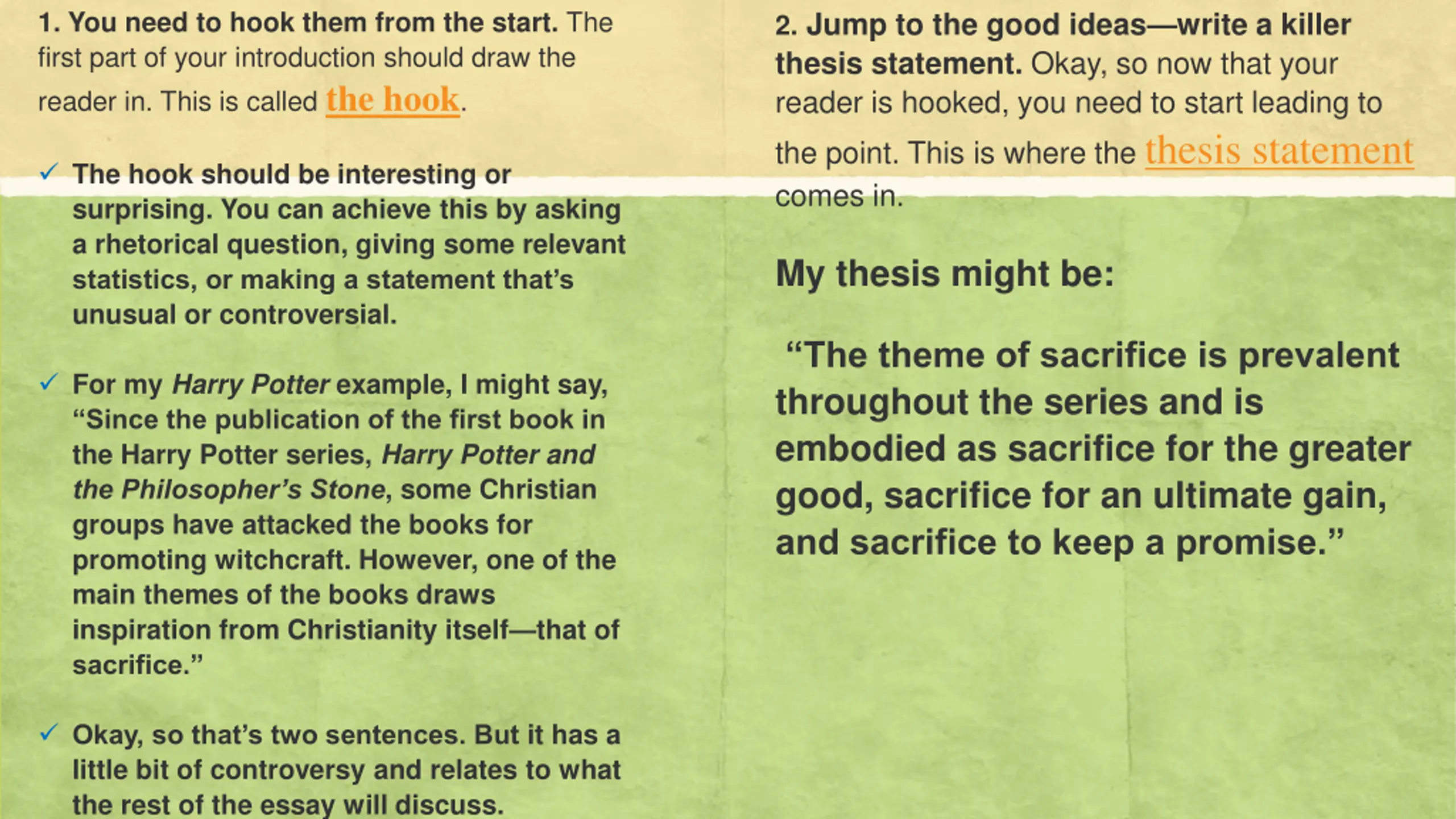 1. You need to hook them from the start. The first part of your introduction should draw the reader in. This is called the hook. 2. Jump to the good ideas write a killer thesis statement. Okay, so now that your reader is hooked, you need to start leading to the point. This is where the thesis statement comes in. The hook should be interesting or surprising. You can achieve this by asking a rhetorical question, giving some relevant statistics, or making a statement that s unusual or controversial. My thesis might be: The theme of sacrifice is prevalent throughout the series and is embodied as sacrifice for the greater good, sacrifice for an ultimate gain, and sacrifice to keep a promise. For my Harry Potter example, I might say, Since the publication of the first book in the Harry Potter series, Harry Potter and the Philosopher s Stone, some Christian groups have attacked the books for promoting witchcraft. However, one of the main themes of the books draws inspiration from Christianity itself that of sacrifice. Okay, so that s two sentences. But it has a little bit of controversy and relates to what the rest of the essay will discuss.