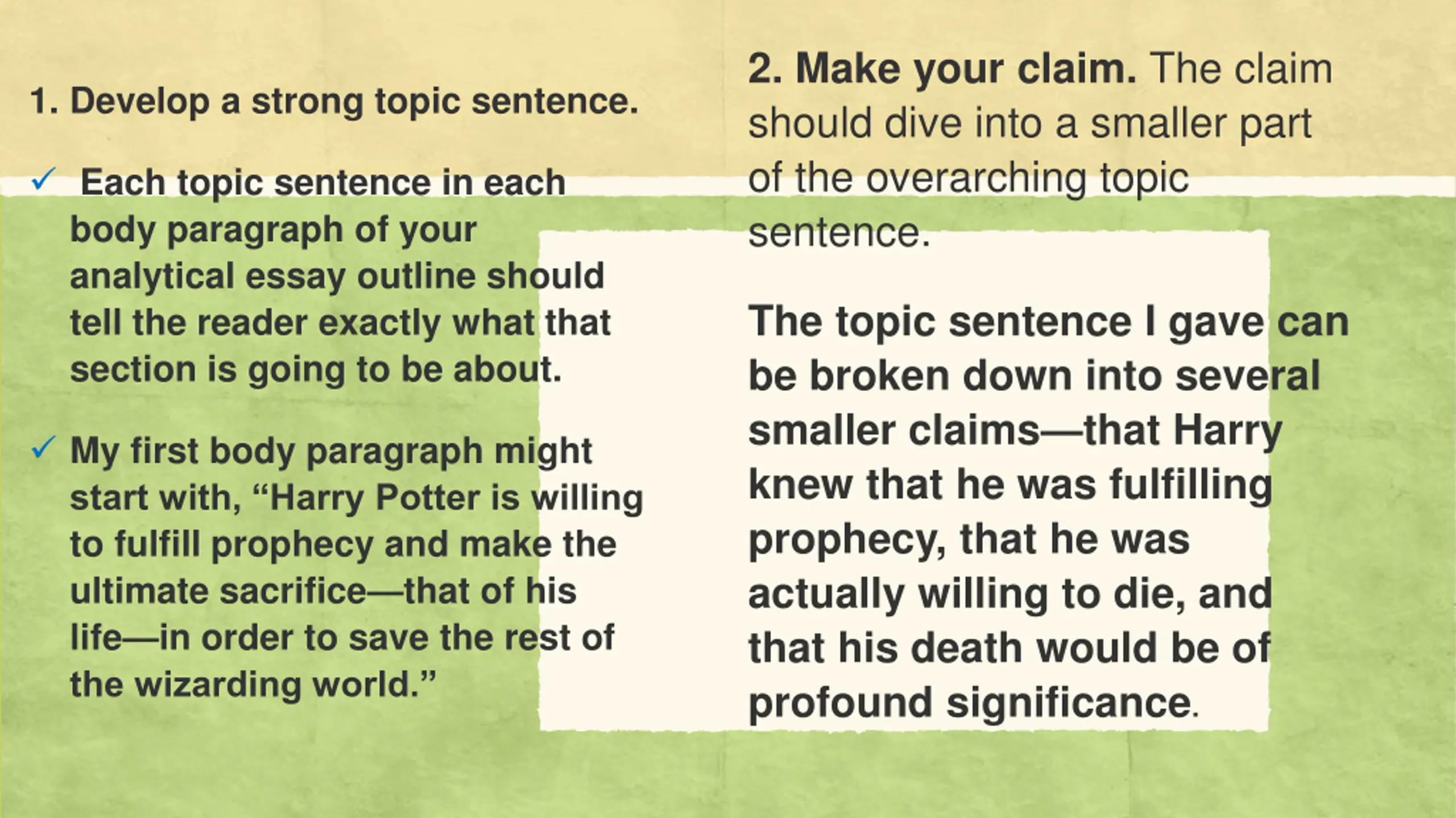 2. Make your claim. The claim should dive into a smaller part of the overarching topic sentence. 1. Develop a strong topic sentence. Each topic sentence in each body paragraph of your analytical essay outline should tell the reader exactly what that section is going to be about. The topic sentence I gave can be broken down into several smaller claims that Harry knew that he was fulfilling prophecy, that he was actually willing to die, and that his death would be of profound significance. My first body paragraph might start with, Harry Potter is willing to fulfill prophecy and make the ultimate sacrifice that of his life in order to save the rest of the wizarding world.