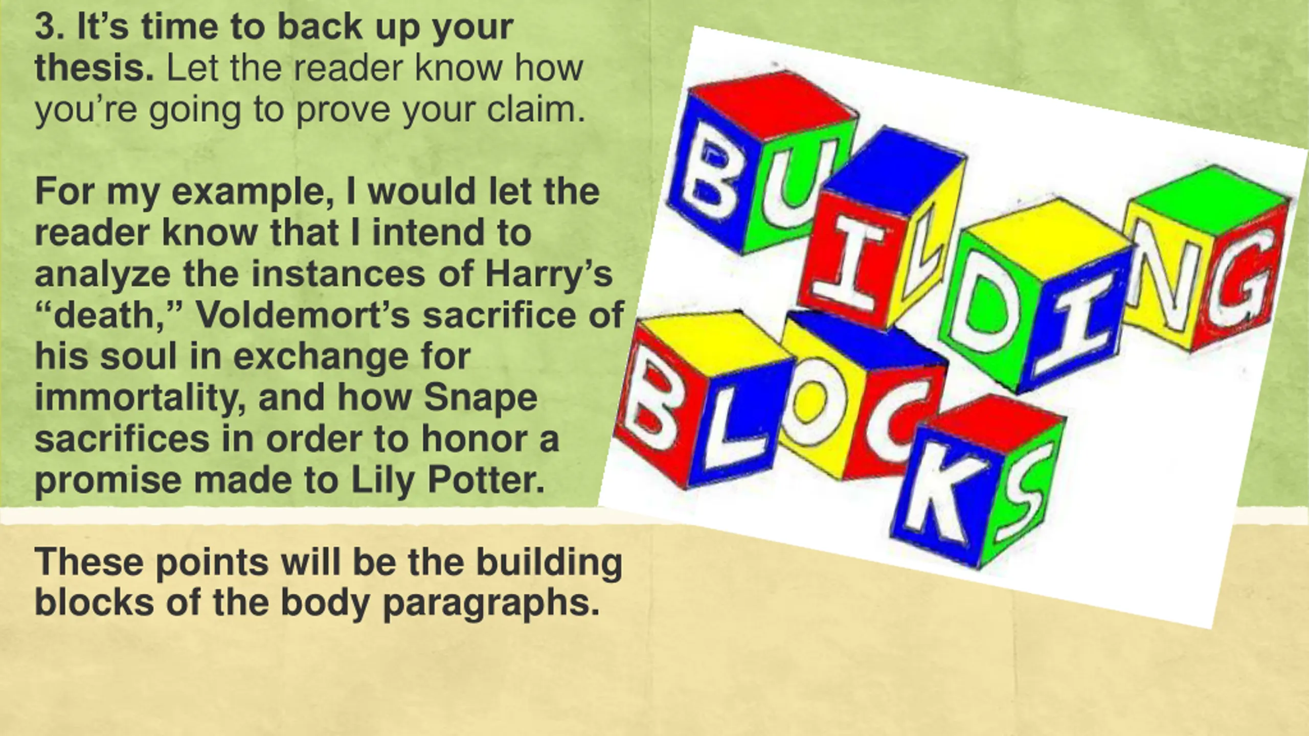 3. Its time to back up your thesis. Let the reader know how you re going to prove your claim. For my example, I would let the reader know that I intend to analyze the instances of Harry s death, Voldemort s sacrifice of his soul in exchange for immortality, and how Snape sacrifices in order to honor a promise made to Lily Potter. These points will be the building blocks of the body paragraphs.
