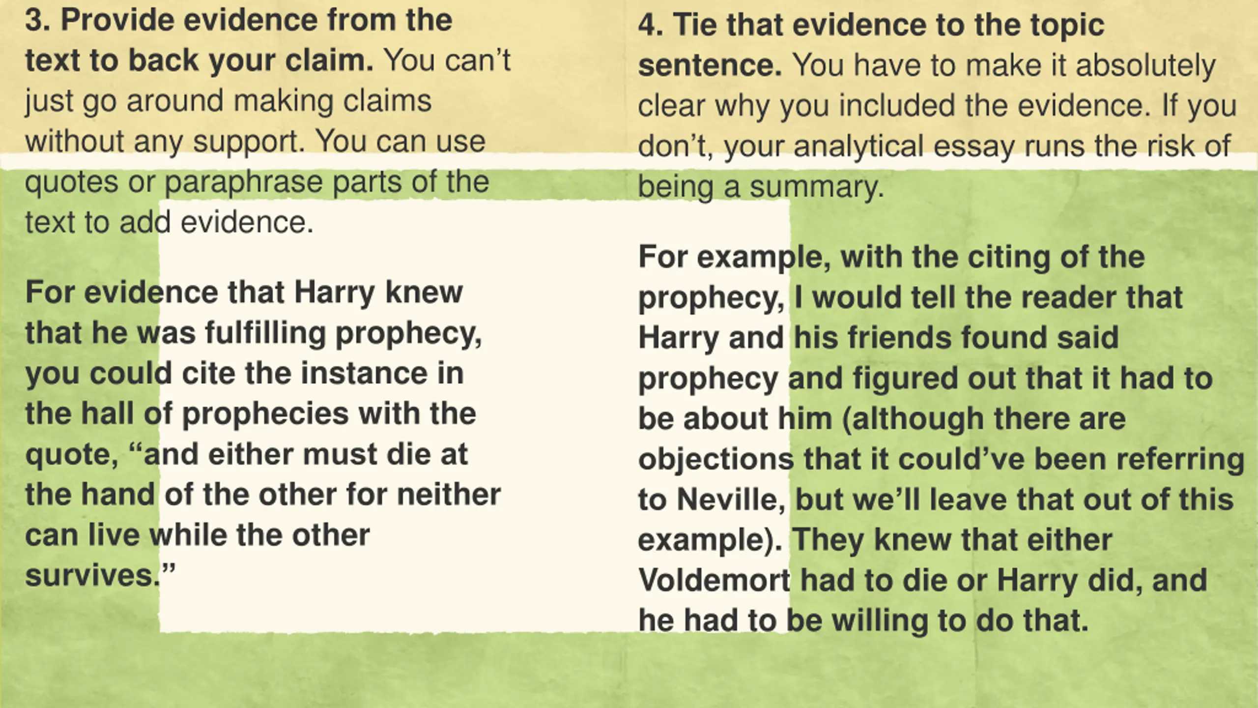 3. Provide evidence from the text to back your claim. You can t just go around making claims without any support. You can use quotes or paraphrase parts of the text to add evidence. 4. Tie that evidence to the topic sentence. You have to make it absolutely clear why you included the evidence. If you don t, your analytical essay runs the risk of being a summary. For example, with the citing of the prophecy, I would tell the reader that Harry and his friends found said prophecy and figured out that it had to be about him (although there are objections that it could ve been referring to Neville, but we ll leave that out of this example). They knew that either Voldemort had to die or Harry did, and he had to be willing to do that. For evidence that Harry knew that he was fulfilling prophecy, you could cite the instance in the hall of prophecies with the quote, and either must die at the hand of the other for neither can live while the other survives.