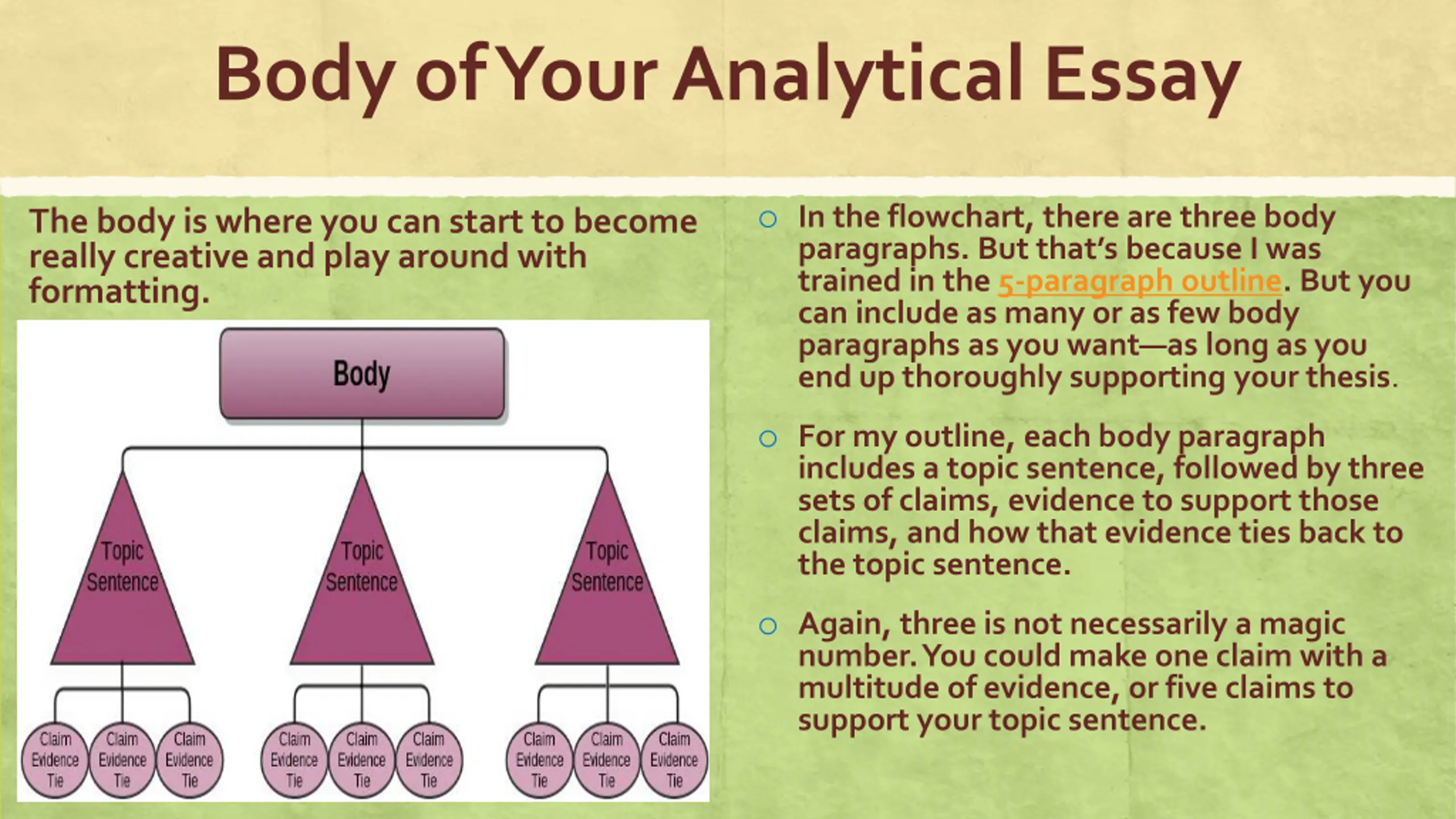 Body of Your Analytical Essay o In the flowchart, there are three body paragraphs. But that s because I was trained in the 5-paragraph outline. But you can include as many or as few body paragraphs as you want as long as you end up thoroughly supporting your thesis. The body is where you can start to become really creative and play around with formatting. o For my outline, each body paragraph includes a topic sentence, followed by three sets of claims, evidence to support those claims, and how that evidence ties back to the topic sentence. o Again, three is not necessarily a magic number. You could make one claim with a multitude of evidence, or five claims to support your topic sentence.