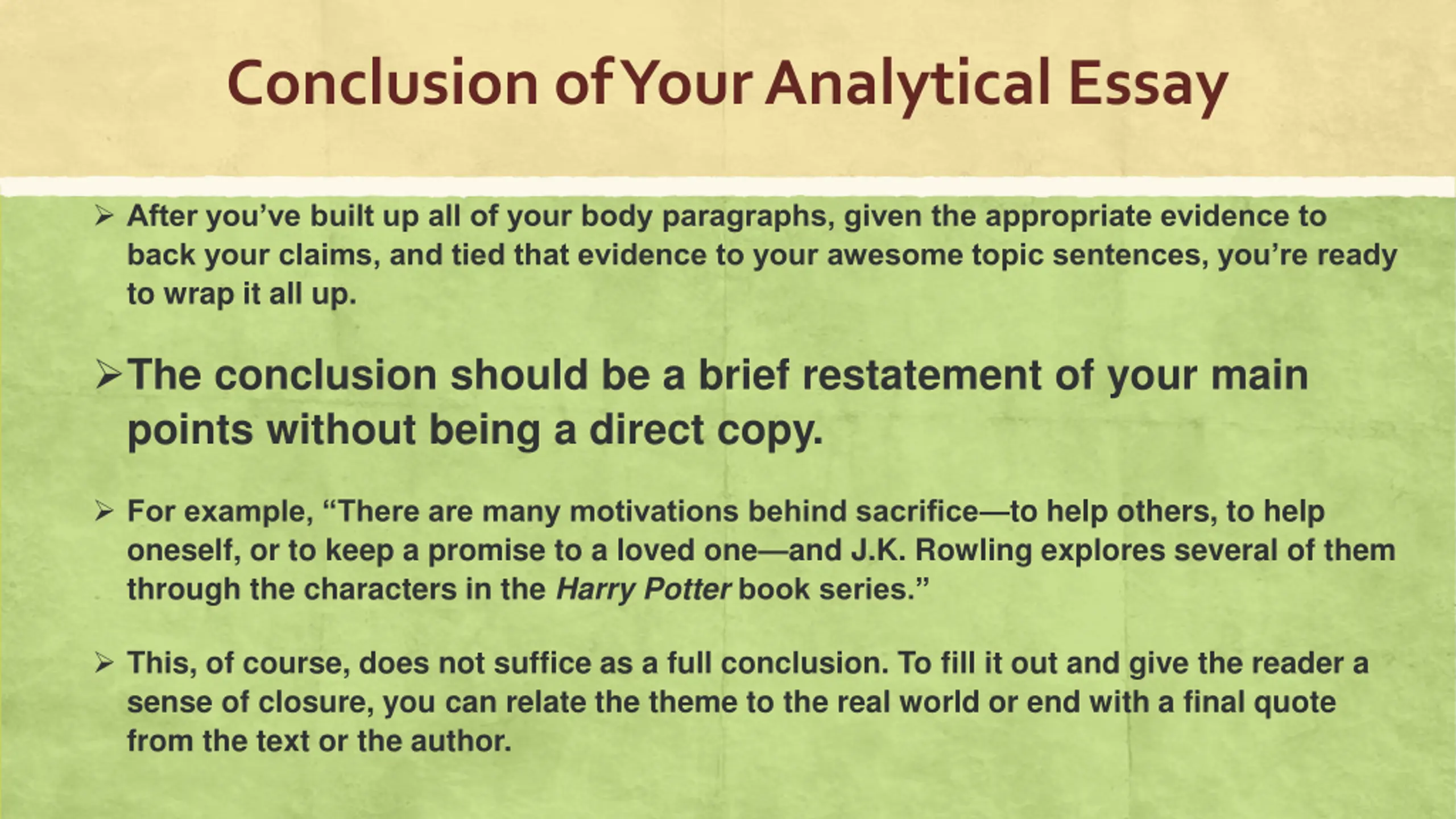 Conclusion of Your Analytical Essay After you ve built up all of your body paragraphs, given the appropriate evidence to back your claims, and tied that evidence to your awesome topic sentences, you re ready to wrap it all up. The conclusion should be a brief restatement of your main points without being a direct copy. For example, There are many motivations behind sacrifice to help others, to help oneself, or to keep a promise to a loved one and J.K. Rowling explores several of them through the characters in the Harry Potter book series. This, of course, does not suffice as a full conclusion. To fill it out and give the reader a sense of closure, you can relate the theme to the real world or end with a final quote from the text or the author.