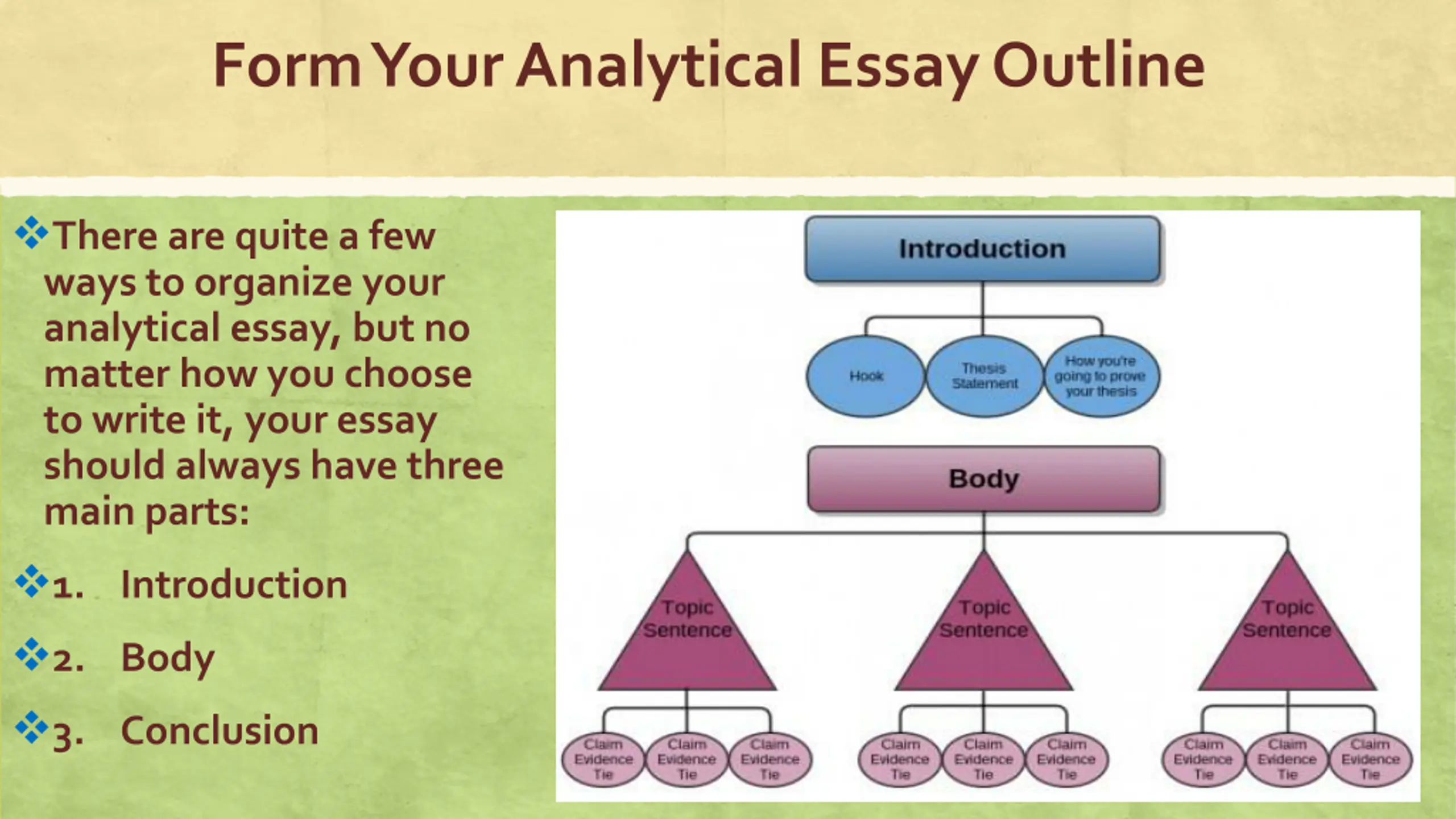 Form Your Analytical Essay Outline There are quite a few ways to organize your analytical essay, but no matter how you choose to write it, your essay should always have three main parts: 1. Introduction 2. Body 3. Conclusion