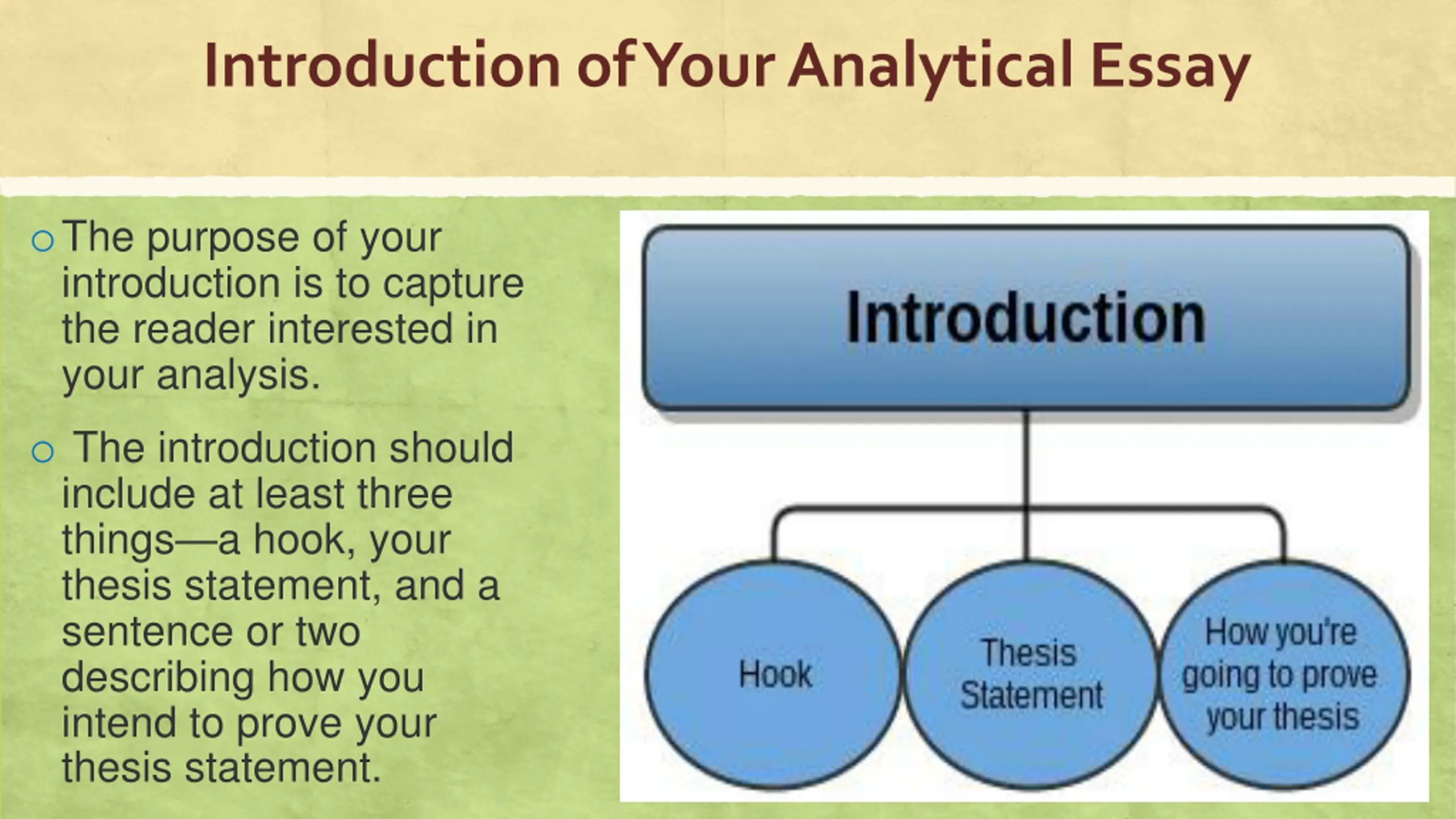 Introduction of Your Analytical Essay oThe purpose of your introduction is to capture the reader interested in your analysis. o The introduction should include at least three things a hook, your thesis statement, and a sentence or two describing how you intend to prove your thesis statement.