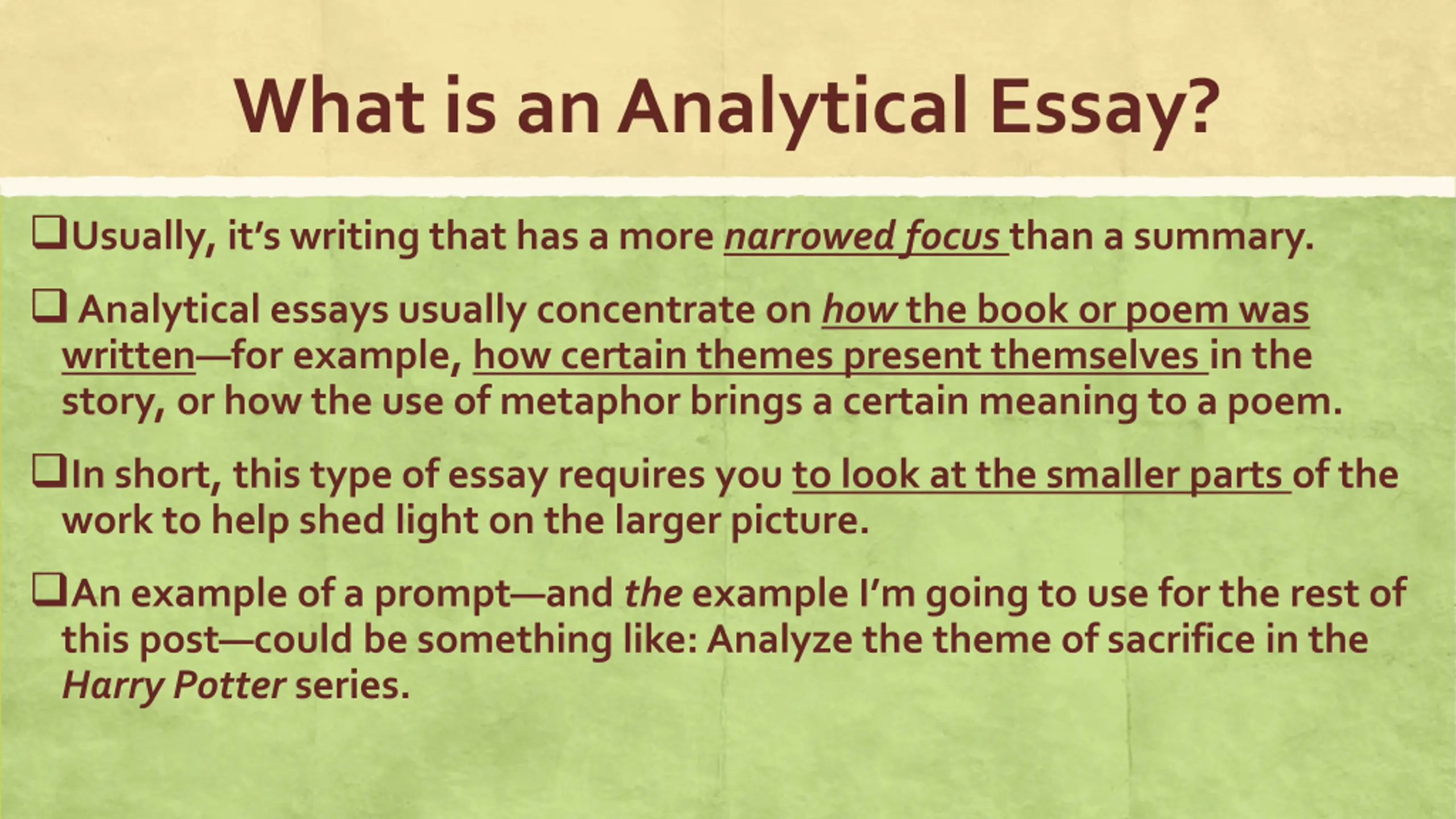 What is an Analytical Essay? Usually, it s writing that has a more narrowed focus than a summary. Analytical essays usually concentrate on how the book or poem was written for example, how certain themes present themselves in the story, or how the use of metaphor brings a certain meaning to a poem. In short, this type of essay requires you to look at the smaller parts of the work to help shed light on the larger picture. An example of a prompt and the example I m going to use for the rest of this post could be something like: Analyze the theme of sacrifice in the Harry Potter series.