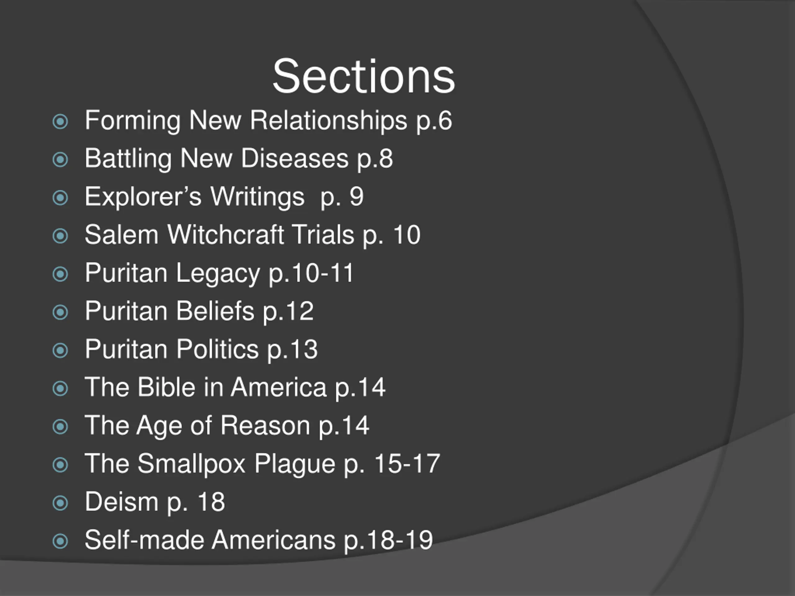 Sections Forming New Relationships p.6 Battling New Diseases p.8 Explorer s Writings p. 9 Salem Witchcraft Trials p. 10 Puritan Legacy p.10-11 Puritan Beliefs p.12 Puritan Politics p.13 The Bible in America p.14 The Age of Reason p.14 The Smallpox Plague p. 15-17 Deism p. 18 Self-made Americans p.18-19