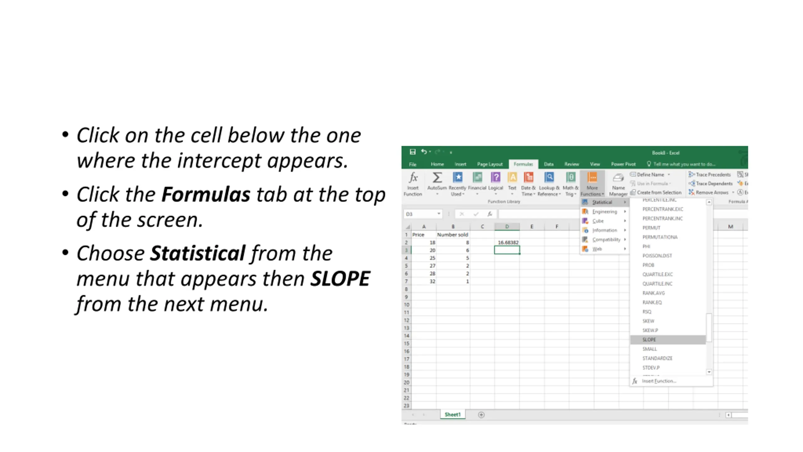 Click on the cell below the one where the intercept appears. Click the Formulas tab at the top of the screen. Choose Statistical from the menu that appears then SLOPE from the next menu.