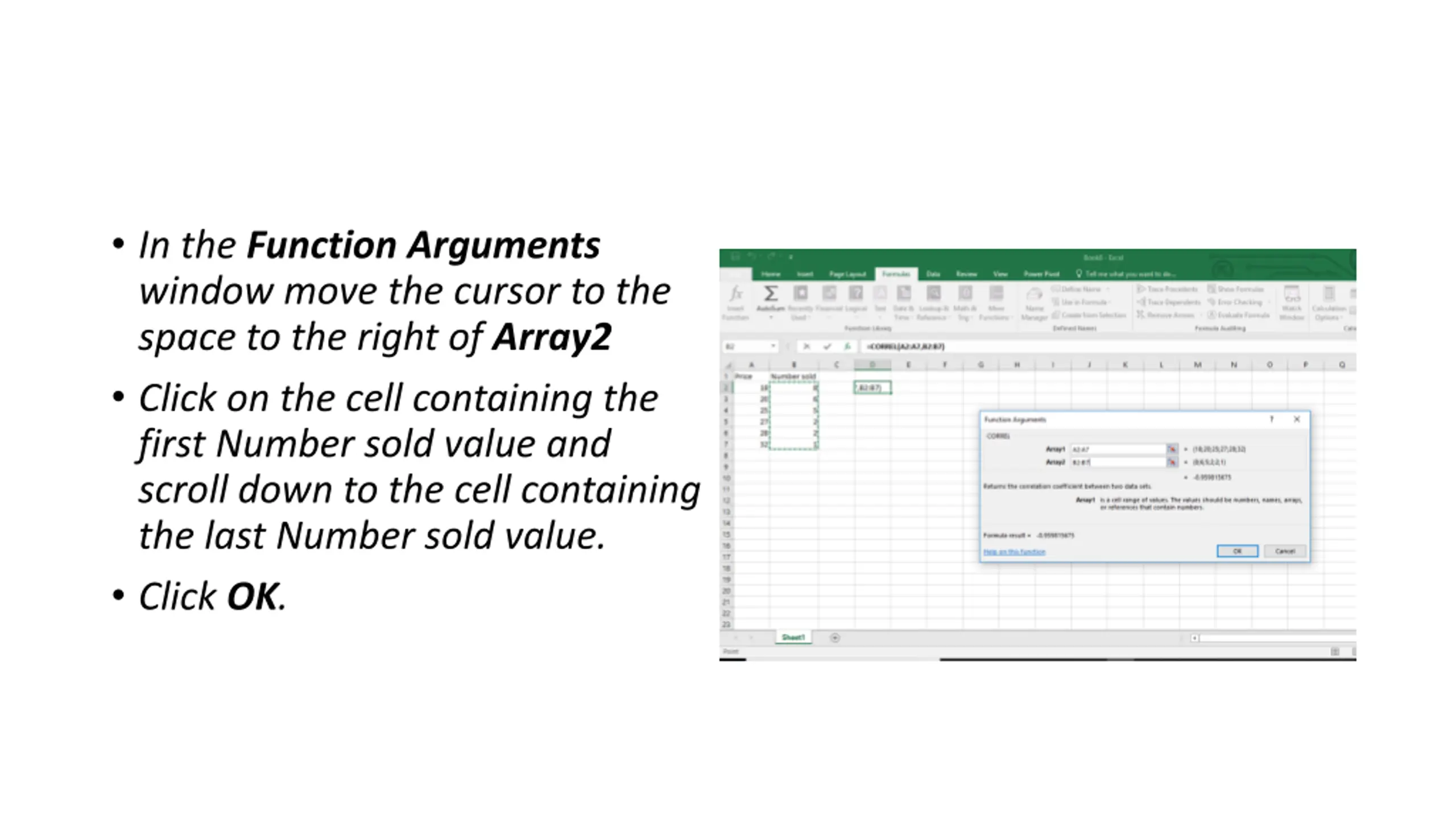 In the Function Arguments window move the cursor to the space to the right of Array2 Click on the cell containing the first Number sold value and scroll down to the cell containing the last Number sold value. Click OK.