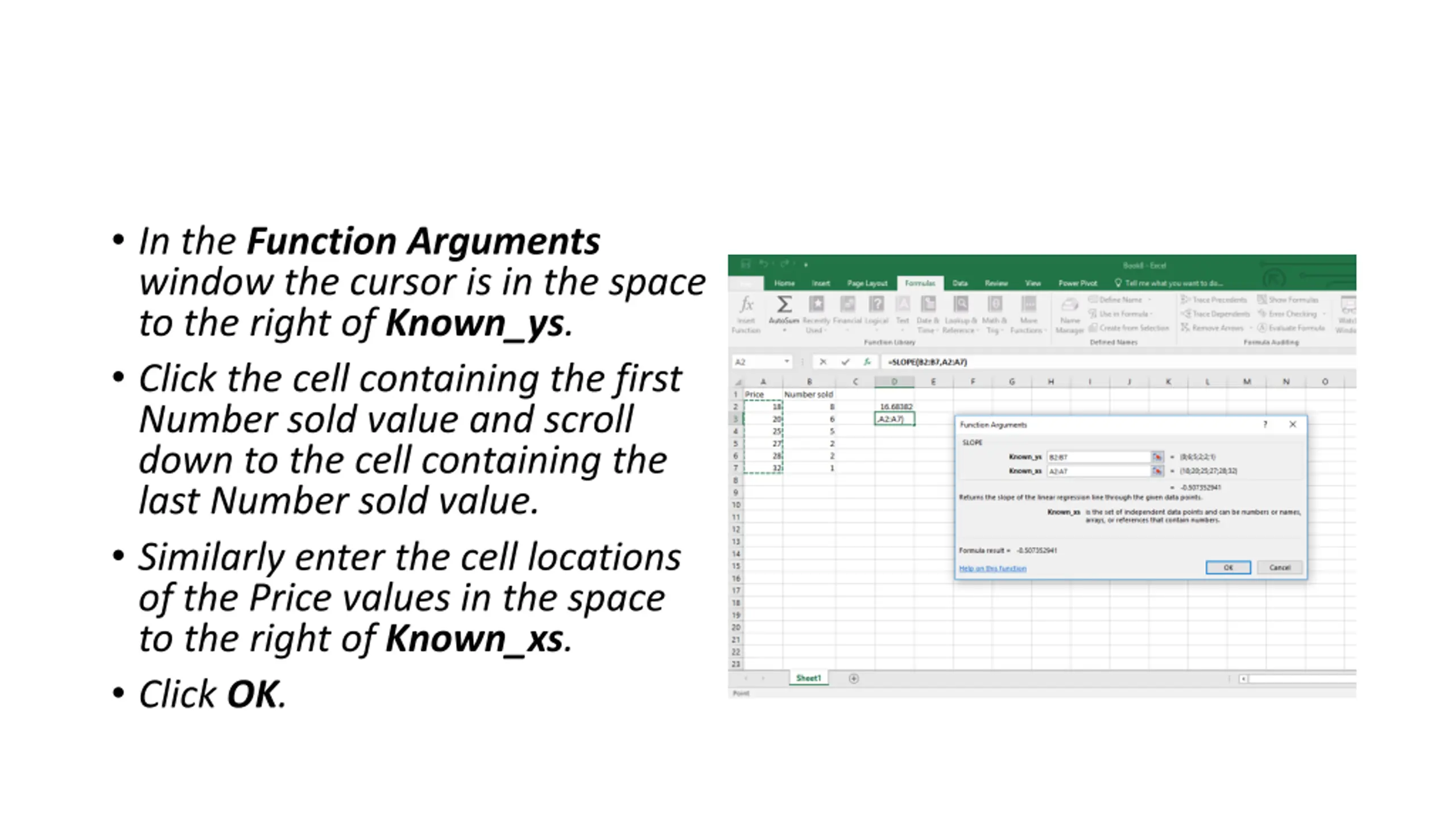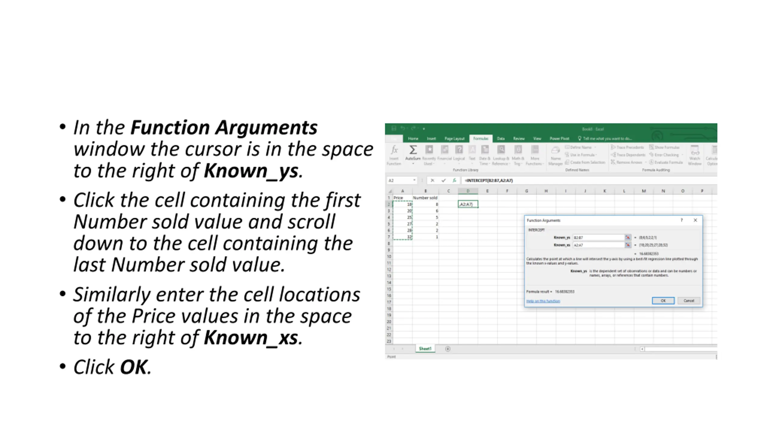 In the Function Arguments window the cursor is in the space to the right of Known_ys. Click the cell containing the first Number sold value and scroll down to the cell containing the last Number sold value. Similarly enter the cell locations of the Price values in the space to the right of Known_xs. Click OK.