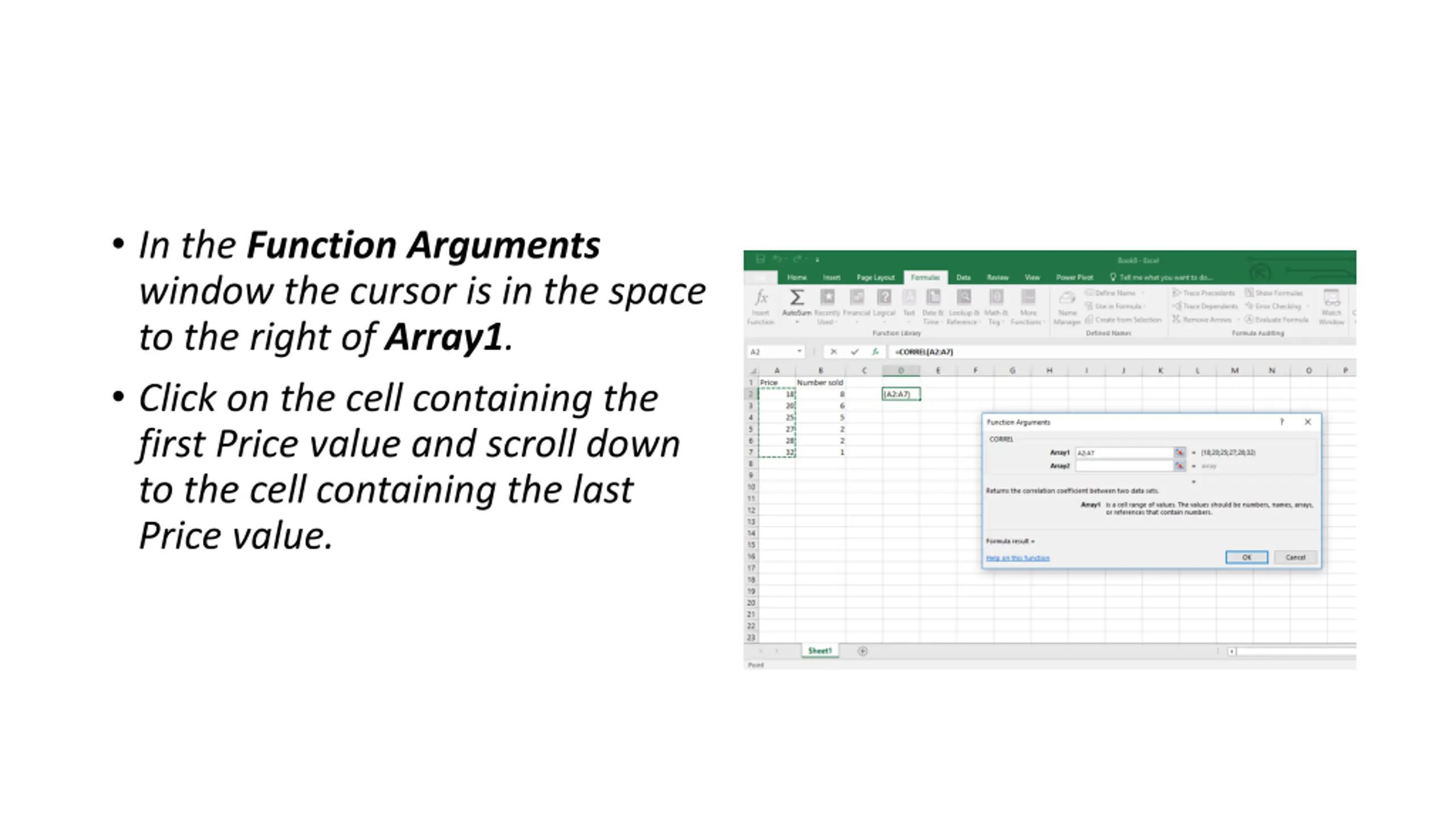 In the Function Arguments window the cursor is in the space to the right of Array1. Click on the cell containing the first Price value and scroll down to the cell containing the last Price value.