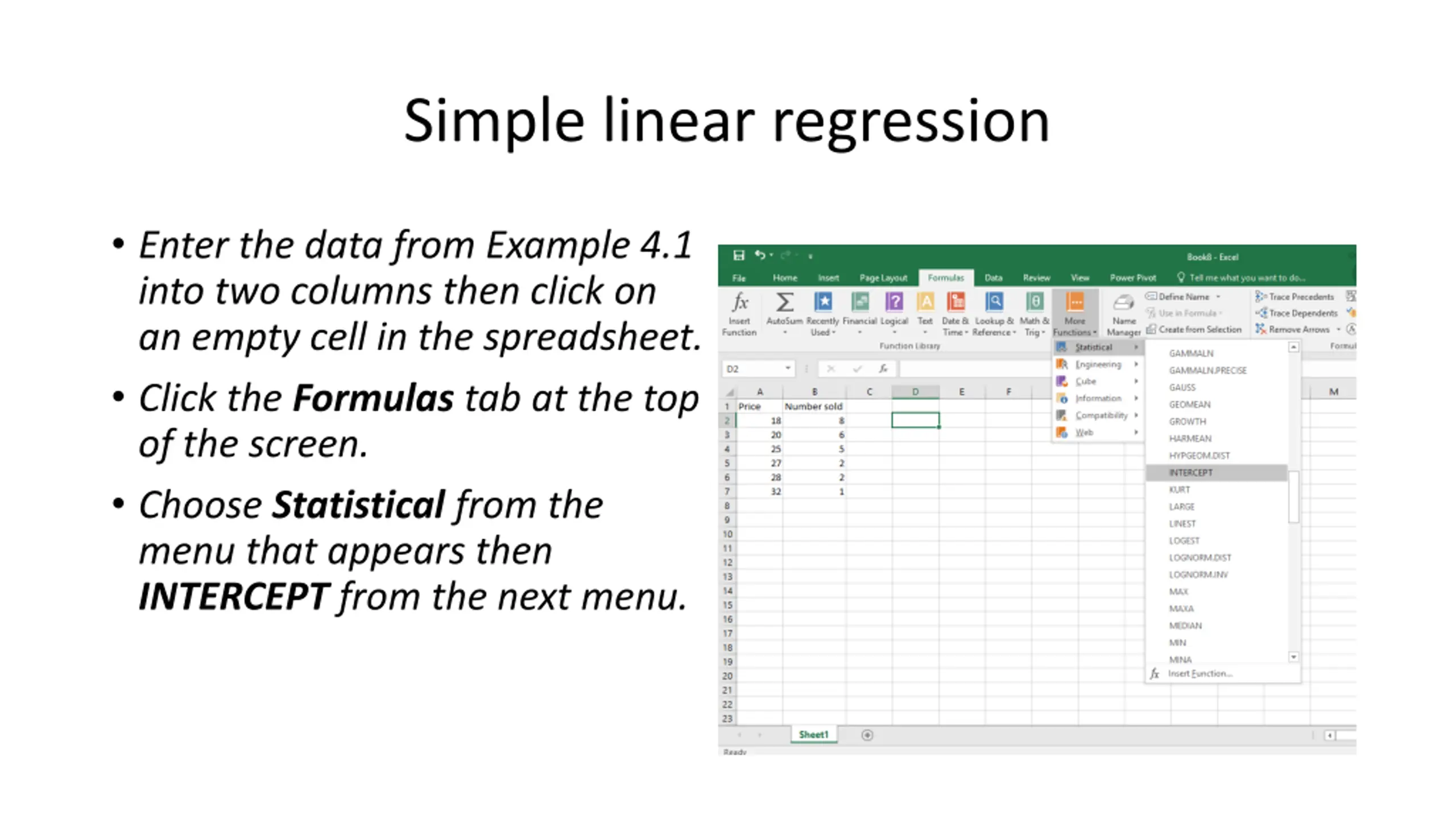 Simple linear regression Enter the data from Example 4.1 into two columns then click on an empty cell in the spreadsheet. Click the Formulas tab at the top of the screen. Choose Statistical from the menu that appears then INTERCEPT from the next menu.