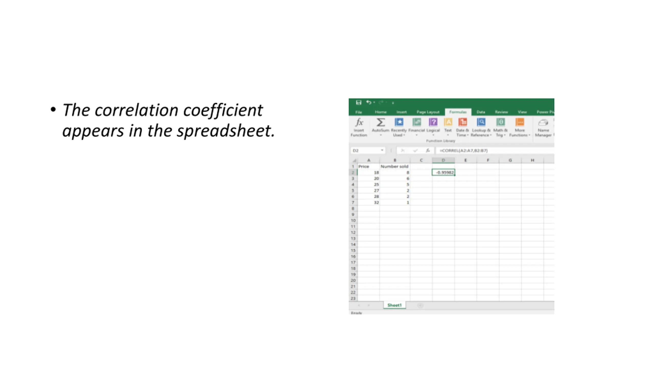 Correlation coefficient Enter the data from Example 4.1 into two columns then click on an empty cell in the spreadsheet. Click the Formulas tab at the top of the screen. Choose Statistical from the menu that appears then CORREL from the next menu.