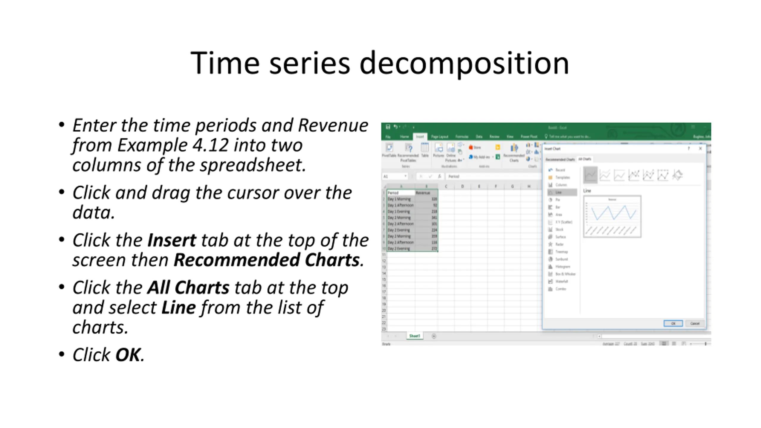 Time series decomposition Enter the time periods and Revenue from Example 4.12 into two columns of the spreadsheet. Click and drag the cursor over the data. Click the Insert tab at the top of the screen then Recommended Charts. Click the All Charts tab at the top and select Line from the list of charts. Click OK.