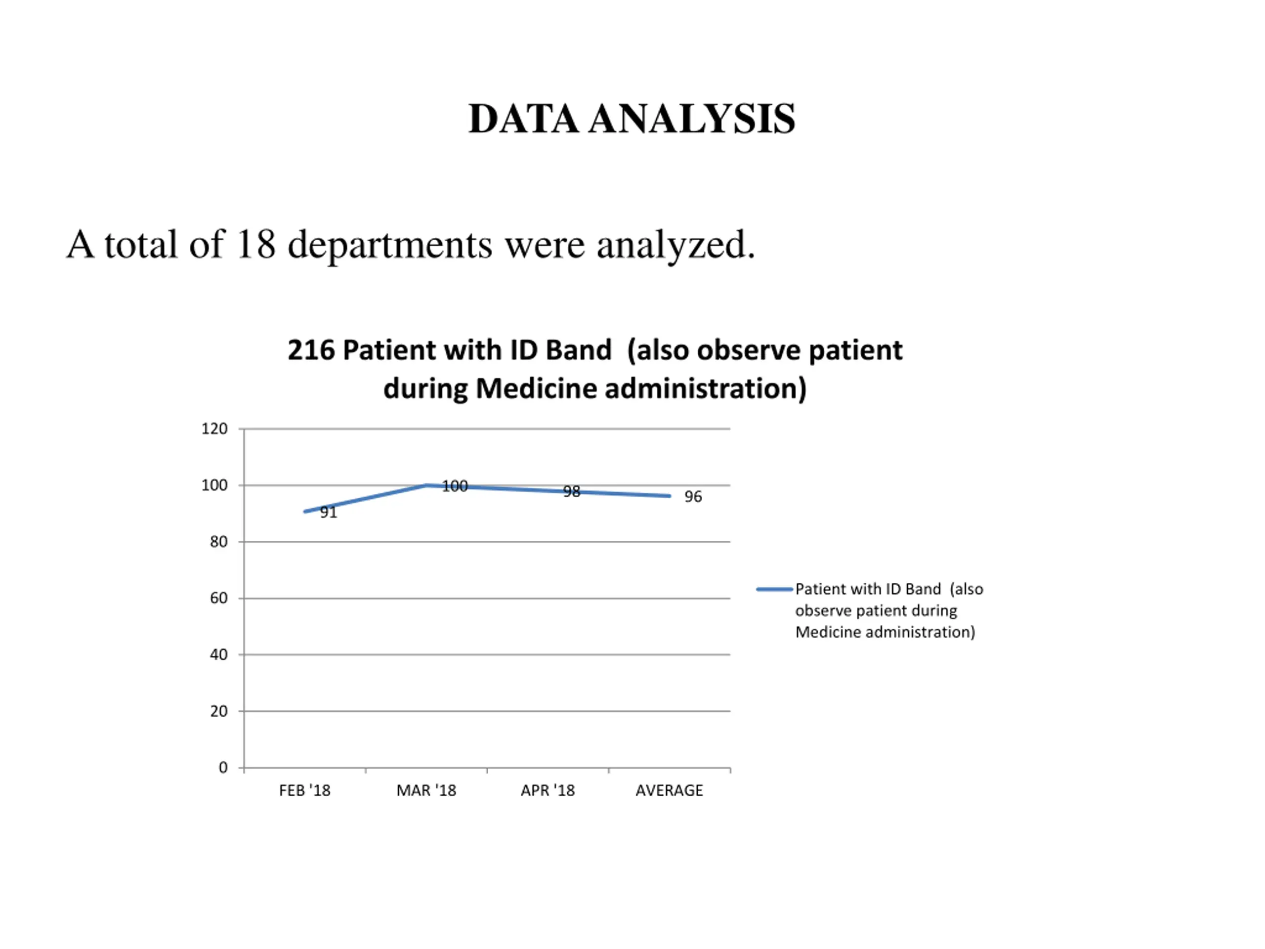 DATA ANALYSIS A total of 18 departments were analyzed. 216 Patient with ID Band (also observe patient during Medicine administration) 120 100 100 98 96 91 80 Patient with ID Band (also observe patient during Medicine administration) 60 40 20 0 FEB '18 MAR '18 APR '18 AVERAGE