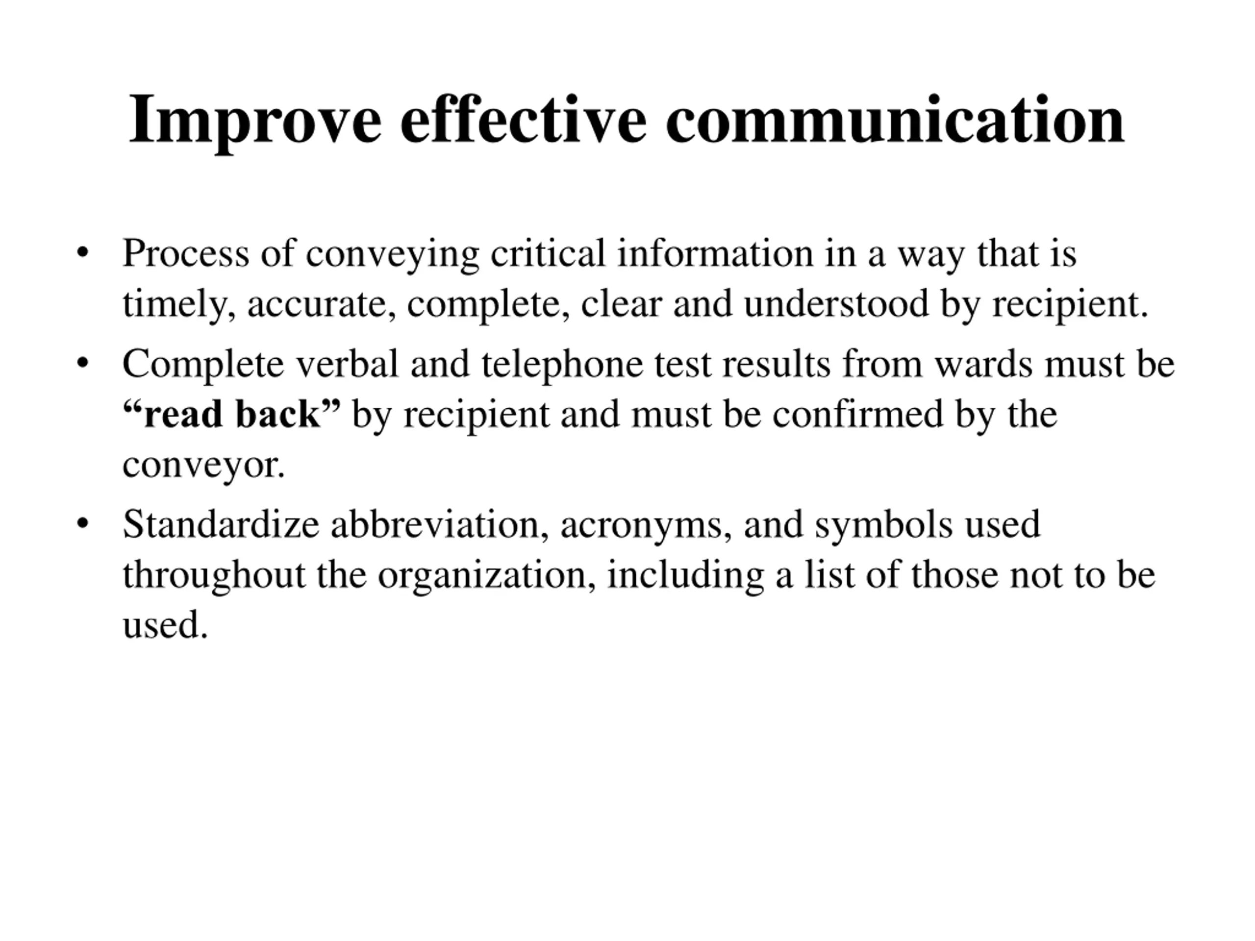 Improve effective communication Process of conveying critical information in a way that is timely, accurate, complete, clear and understood by recipient. Complete verbal and telephone test results from wards must be read back by recipient and must be confirmed by the conveyor. Standardize abbreviation, acronyms, and symbols used throughout the organization, including a list of those not to be used.