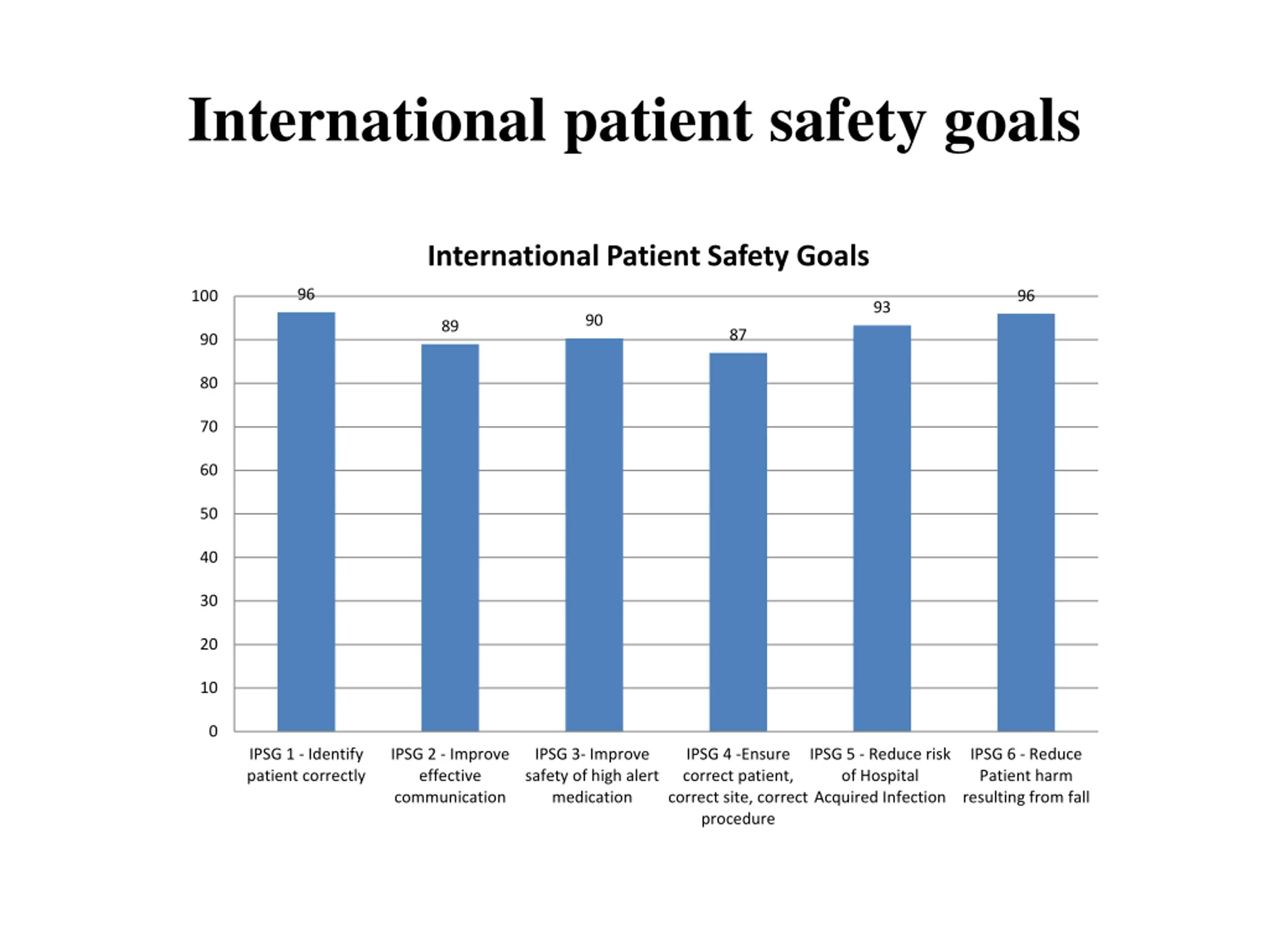 International patient safety goals International Patient Safety Goals 96 96 100 93 90 89 87 90 80 70 60 50 40 30 20 10 0 IPSG 1 - Identify patient correctly IPSG 2 - Improve effective communication IPSG 3- Improve safety of high alert medication IPSG 4 -Ensure correct patient, correct site, correct procedure IPSG 5 - Reduce risk of Hospital Acquired Infection IPSG 6 - Reduce Patient harm resulting from fall