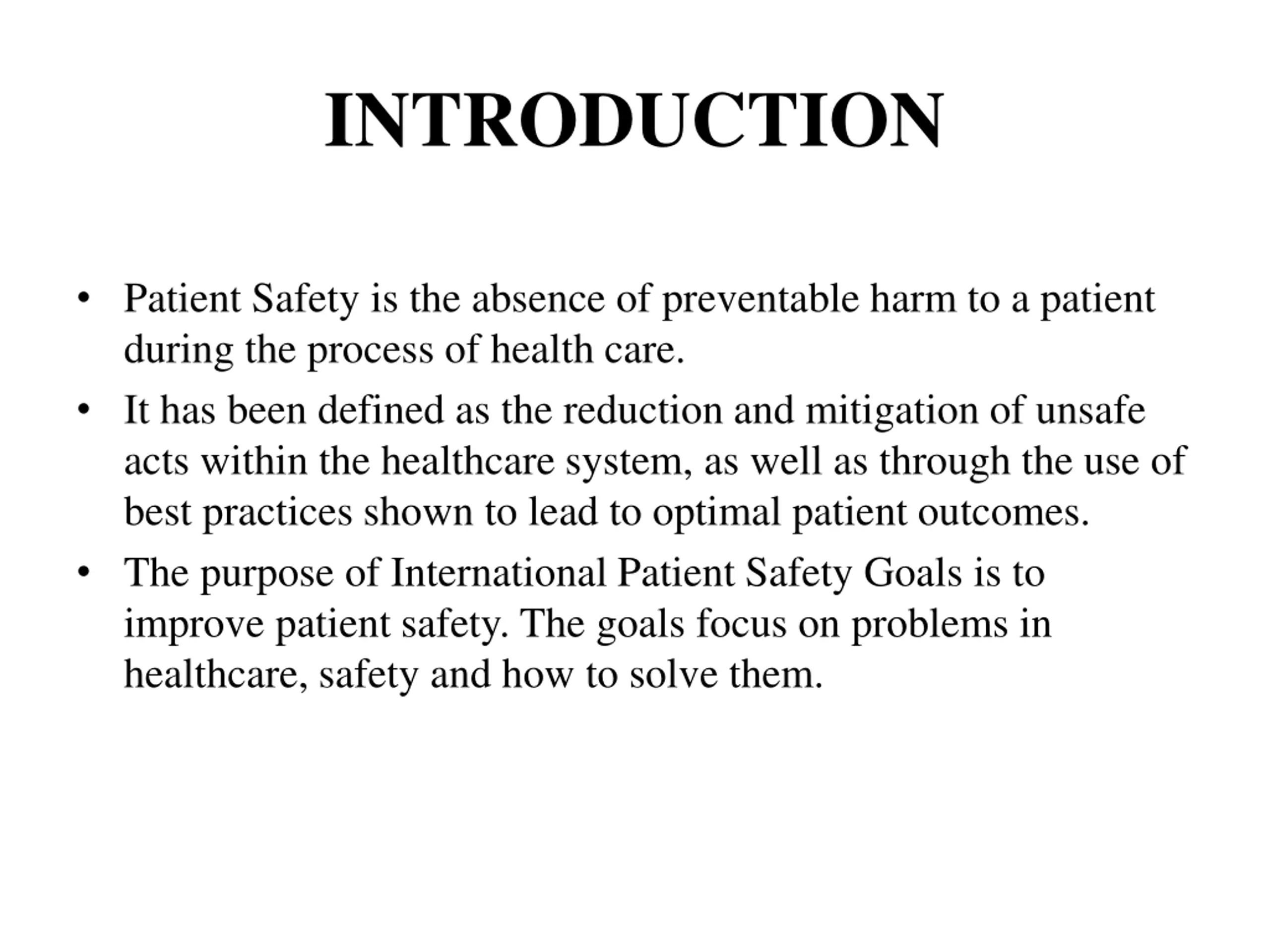 INTRODUCTION Patient Safety is the absence of preventable harm to a patient during the process of health care. It has been defined as the reduction and mitigation of unsafe acts within the healthcare system, as well as through the use of best practices shown to lead to optimal patient outcomes. The purpose of International Patient Safety Goals is to improve patient safety. The goals focus on problems in healthcare, safety and how to solve them.