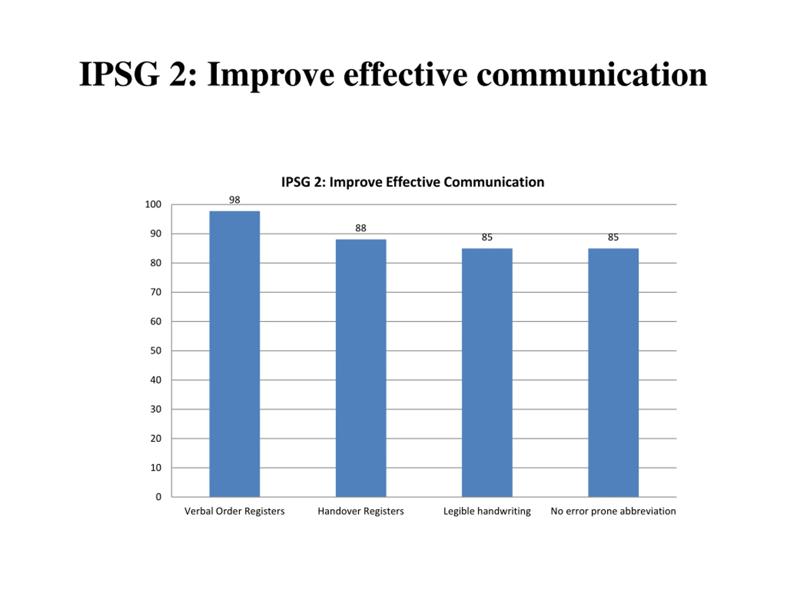 IPSG 2: Improve effective communication IPSG 2: Improve Effective Communication 98 100 88 90 85 85 80 70 60 50 40 30 20 10 0 Verbal Order Registers Handover Registers Legible handwriting No error prone abbreviation