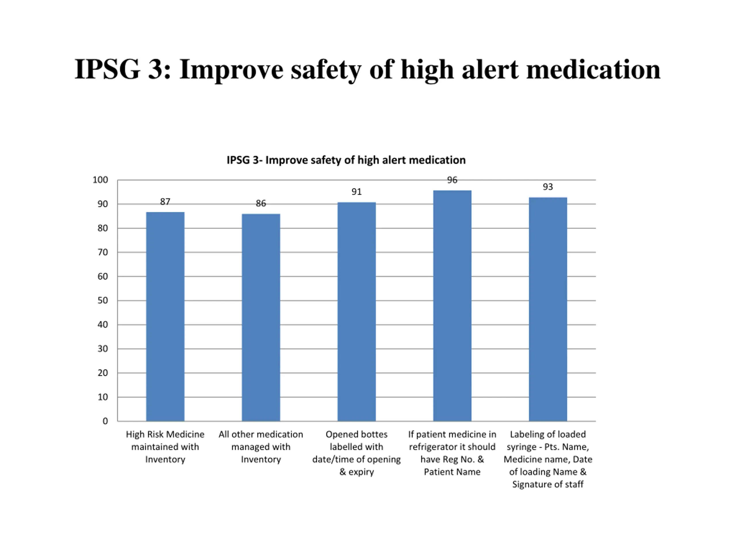 IPSG 3: Improve safety of high alert medication IPSG 3- Improve safety of high alert medication 100 96 93 91 87 86 90 80 70 60 50 40 30 20 10 0 High Risk Medicine maintained with Inventory All other medication managed with Inventory Opened bottes labelled with date/time of opening & expiry If patient medicine in refrigerator it should have Reg No. & Patient Name Labeling of loaded syringe - Pts. Name, Medicine name, Date of loading Name & Signature of staff