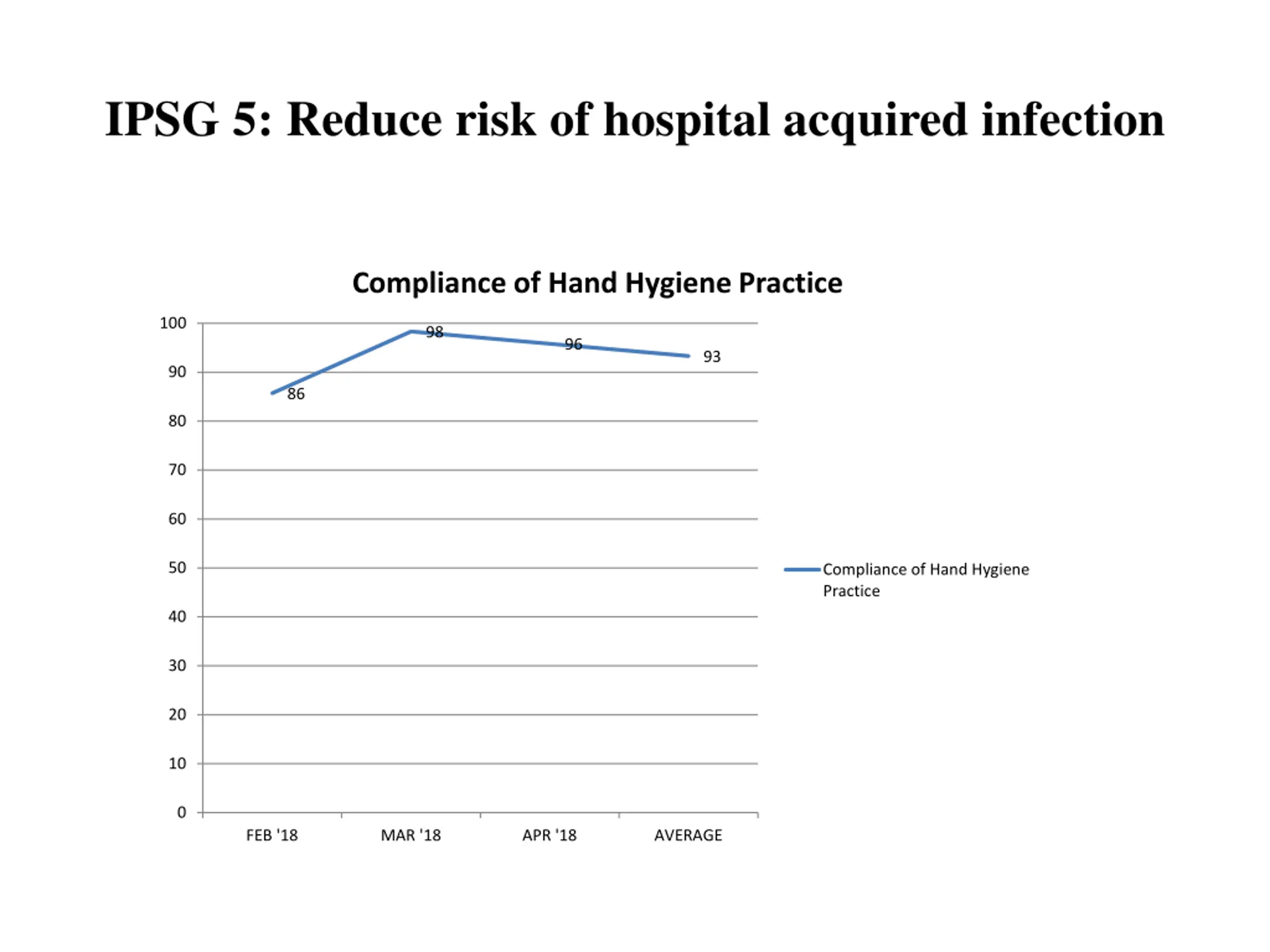 IPSG 5: Reduce risk of hospital acquired infection Compliance of Hand Hygiene Practice 100 98 96 93 90 86 80 70 60 50 Compliance of Hand Hygiene Practice 40 30 20 10 0 FEB '18 MAR '18 APR '18 AVERAGE