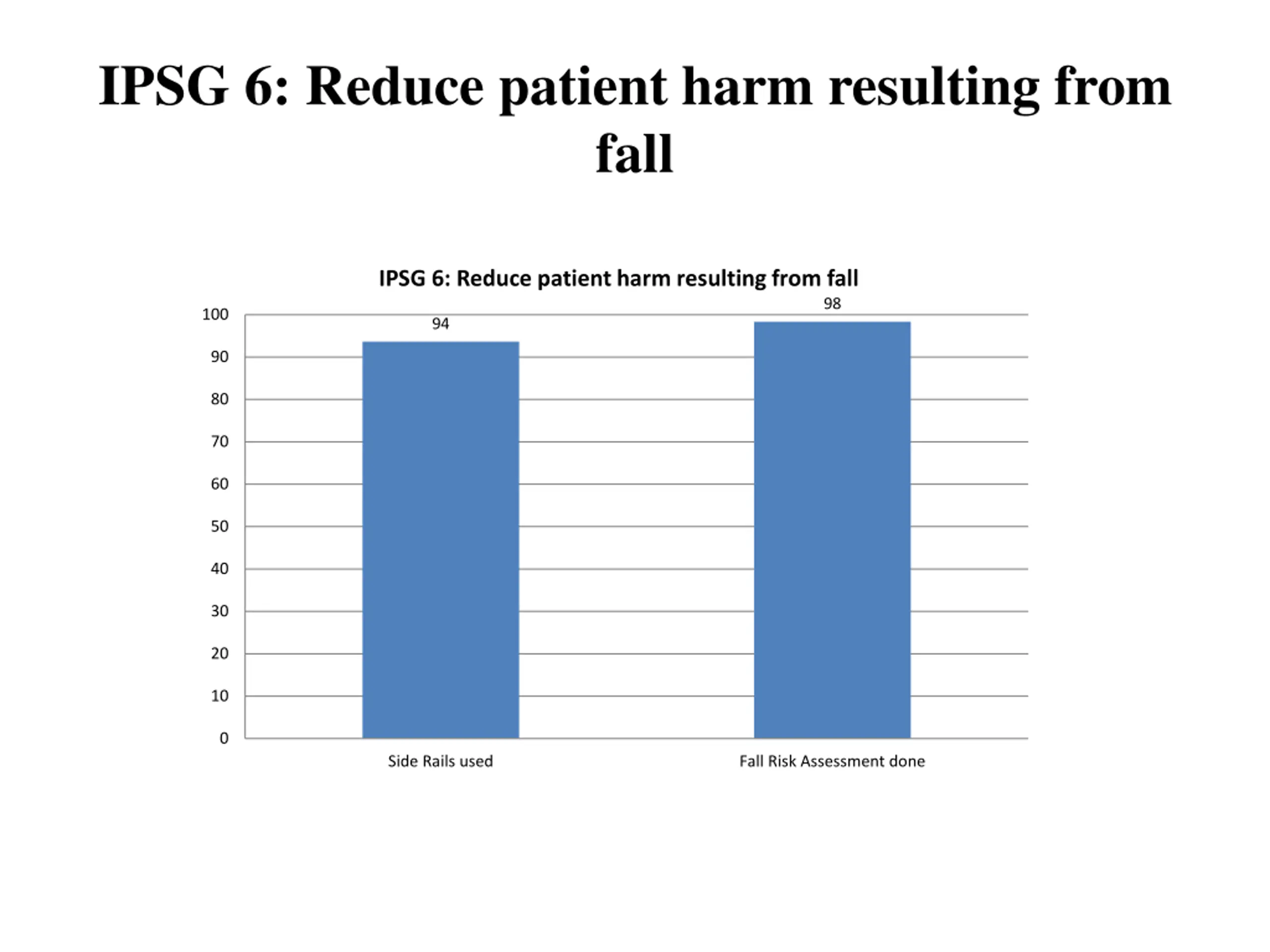 IPSG 6: Reduce patient harm resulting from fall IPSG 6: Reduce patient harm resulting from fall 98 100 94 90 80 70 60 50 40 30 20 10 0 Side Rails used Fall Risk Assessment done