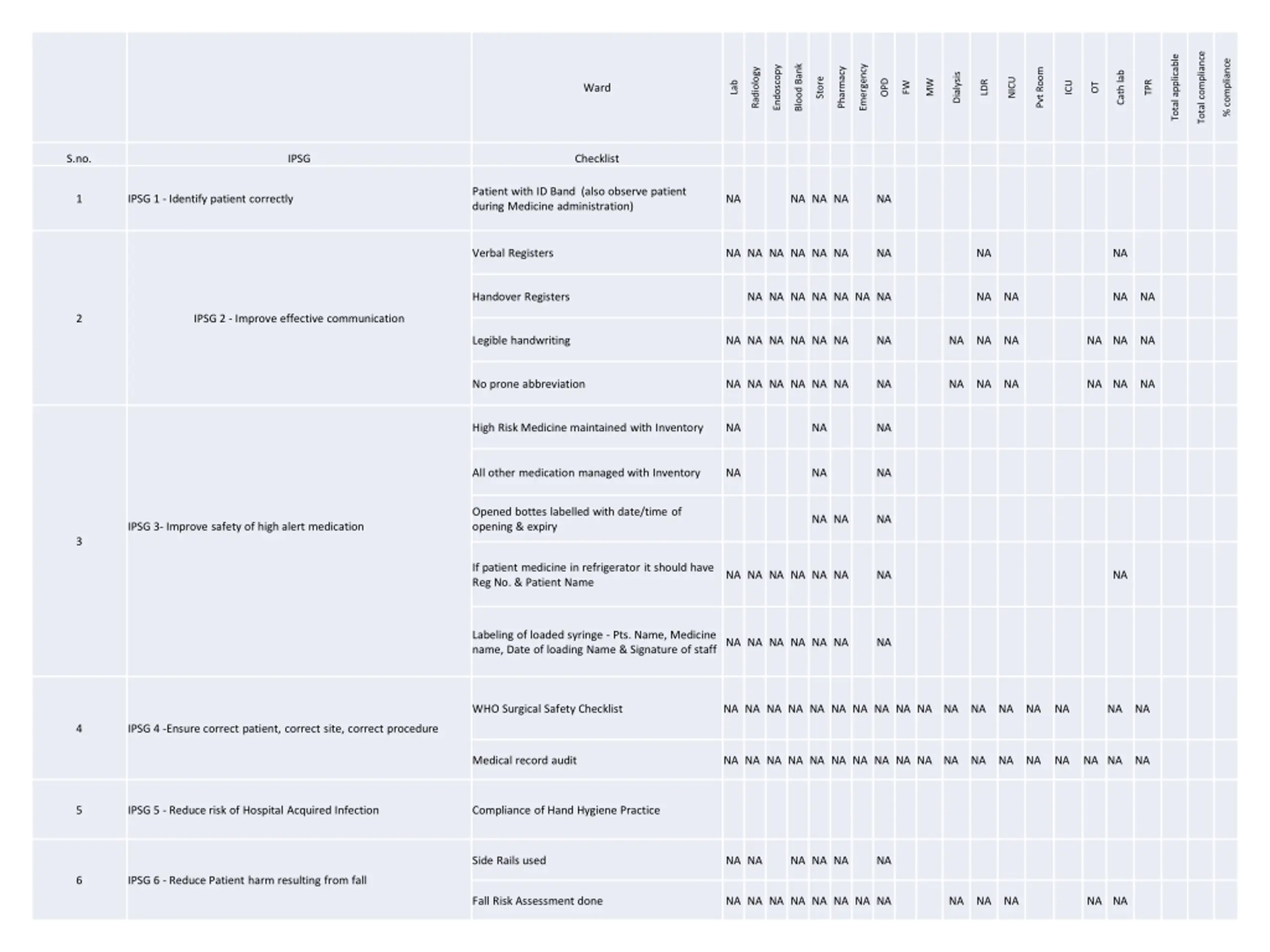 Total compliance Total applicable % compliance Blood Bank Emergency Pharmacy Endoscopy Radiology Pvt Room Cath lab Dialysis Store NICU OPD MW LDR TPR Lab ICU FW OT Ward S.no. IPSG Checklist Patient with ID Band (also observe patient during Medicine administration) 1 IPSG 1 - Identify patient correctly NA NA NA NA NA Verbal Registers NA NA NA NA NA NA NA NA NA Handover Registers NA NA NA NA NA NA NA NA NA NA NA 2 IPSG 2 - Improve effective communication Legible handwriting NA NA NA NA NA NA NA NA NA NA NA NA NA No prone abbreviation NA NA NA NA NA NA NA NA NA NA NA NA NA High Risk Medicine maintained with Inventory NA NA NA All other medication managed with Inventory NA NA NA Opened bottes labelled with date/time of opening & expiry NA NA NA IPSG 3- Improve safety of high alert medication 3 If patient medicine in refrigerator it should have Reg No. & Patient Name NA NA NA NA NA NA NA NA Labeling of loaded syringe - Pts. Name, Medicine name, Date of loading Name & Signature of staff NA NA NA NA NA NA NA WHO Surgical Safety Checklist NA NA NA NA NA NA NA NA NA NA NA NA NA NA NA NA NA 4 IPSG 4 -Ensure correct patient, correct site, correct procedure Medical record audit NA NA NA NA NA NA NA NA NA NA NA NA NA NA NA NA NA NA 5 IPSG 5 - Reduce risk of Hospital Acquired Infection Compliance of Hand Hygiene Practice Side Rails used NA NA NA NA NA NA 6 IPSG 6 - Reduce Patient harm resulting from fall Fall Risk Assessment done NA NA NA NA NA NA NA NA NA NA NA NA NA