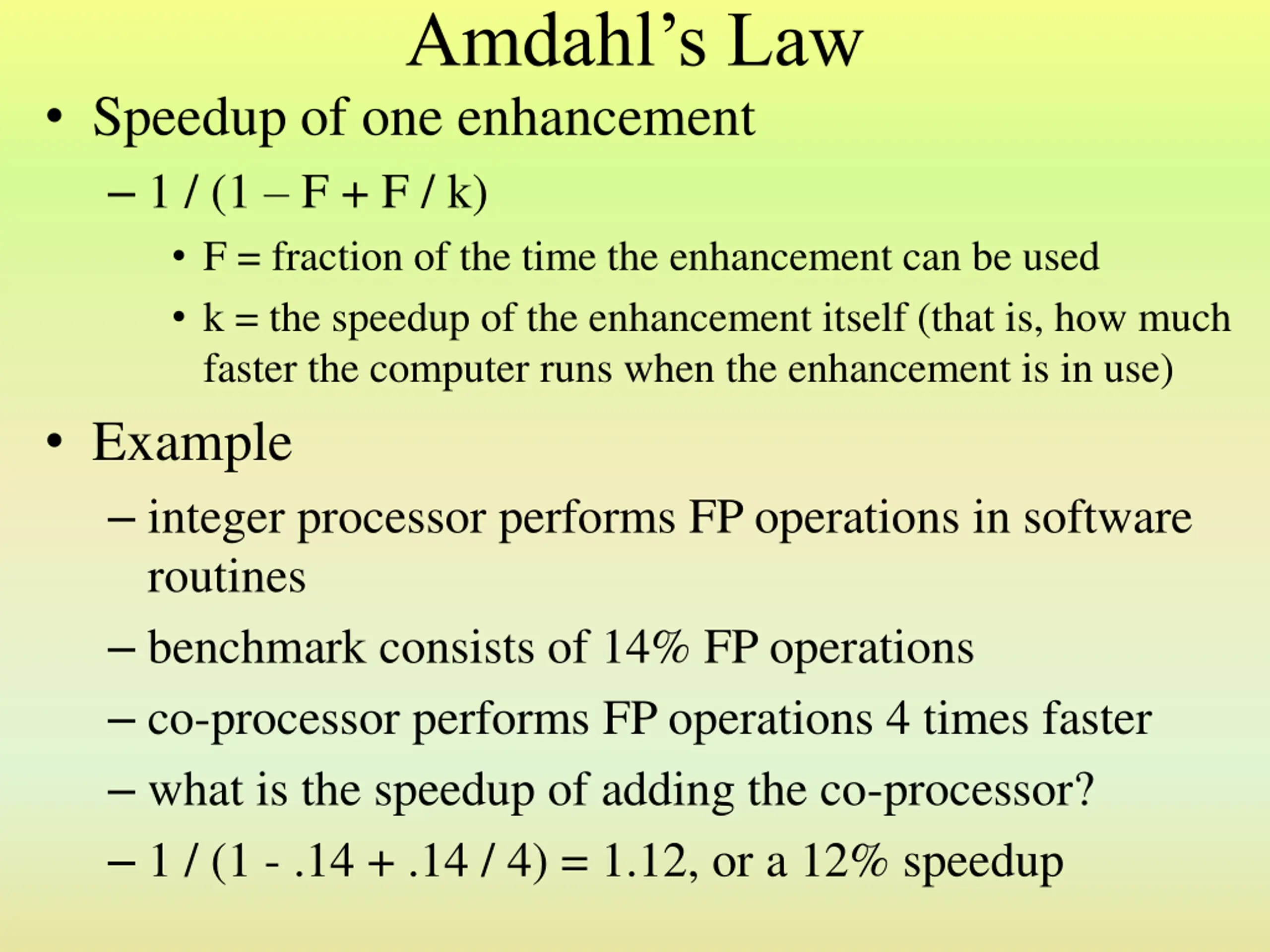 Amdahls Law Speedup of one enhancement 1 / (1 F + F / k) F = fraction of the time the enhancement can be used k = the speedup of the enhancement itself (that is, how much faster the computer runs when the enhancement is in use) Example integer processor performs FP operations in software routines benchmark consists of 14% FP operations co-processor performs FP operations 4 times faster what is the speedup of adding the co-processor? 1 / (1 - .14 + .14 / 4) = 1.12, or a 12% speedup