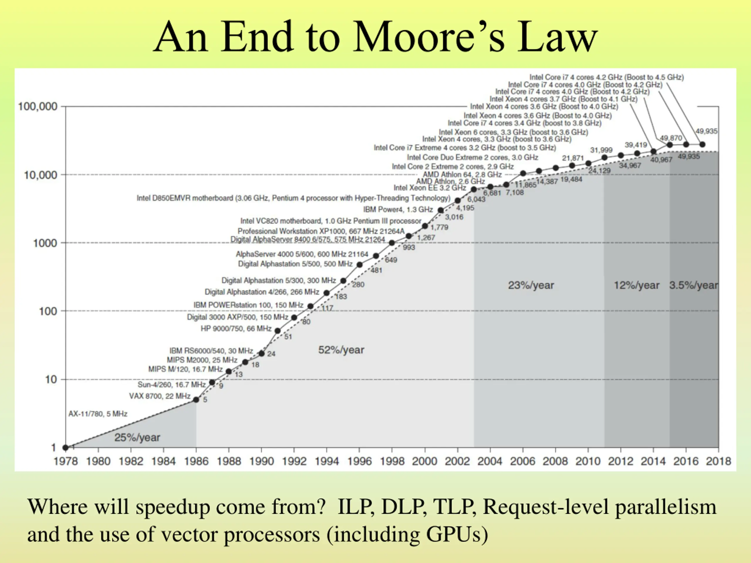 An End to Moores Law Where will speedup come from? ILP, DLP, TLP, Request-level parallelism and the use of vector processors (including GPUs)