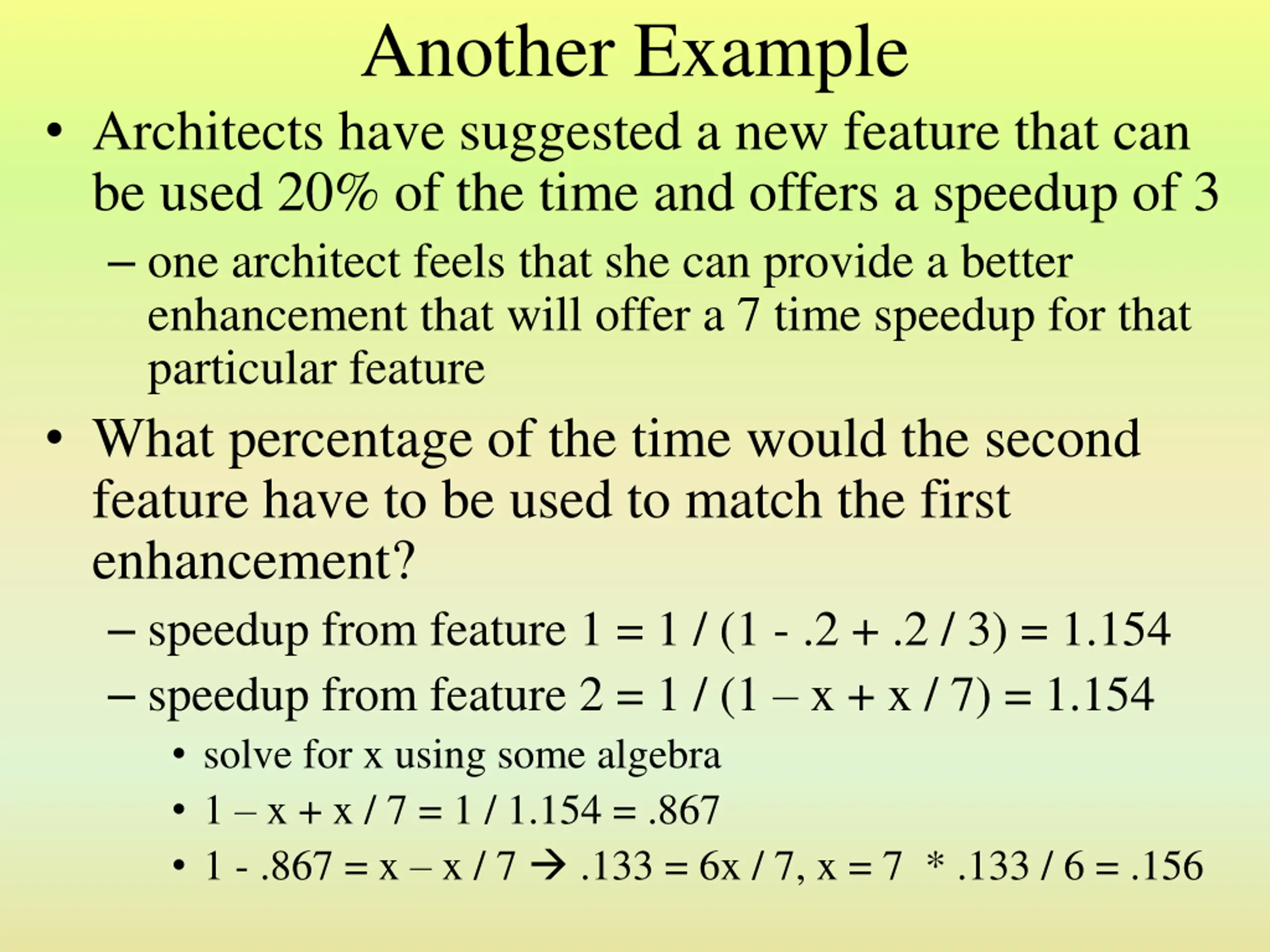 Another Example Architects have suggested a new feature that can be used 20% of the time and offers a speedup of 3 one architect feels that she can provide a better enhancement that will offer a 7 time speedup for that particular feature What percentage of the time would the second feature have to be used to match the first enhancement? speedup from feature 1 = 1 / (1 - .2 + .2 / 3) = 1.154 speedup from feature 2 = 1 / (1 x + x / 7) = 1.154 solve for x using some algebra 1 x + x / 7 = 1 / 1.154 = .867 1 - .867 = x x / 7 .133 = 6x / 7, x = 7 * .133 / 6 = .156
