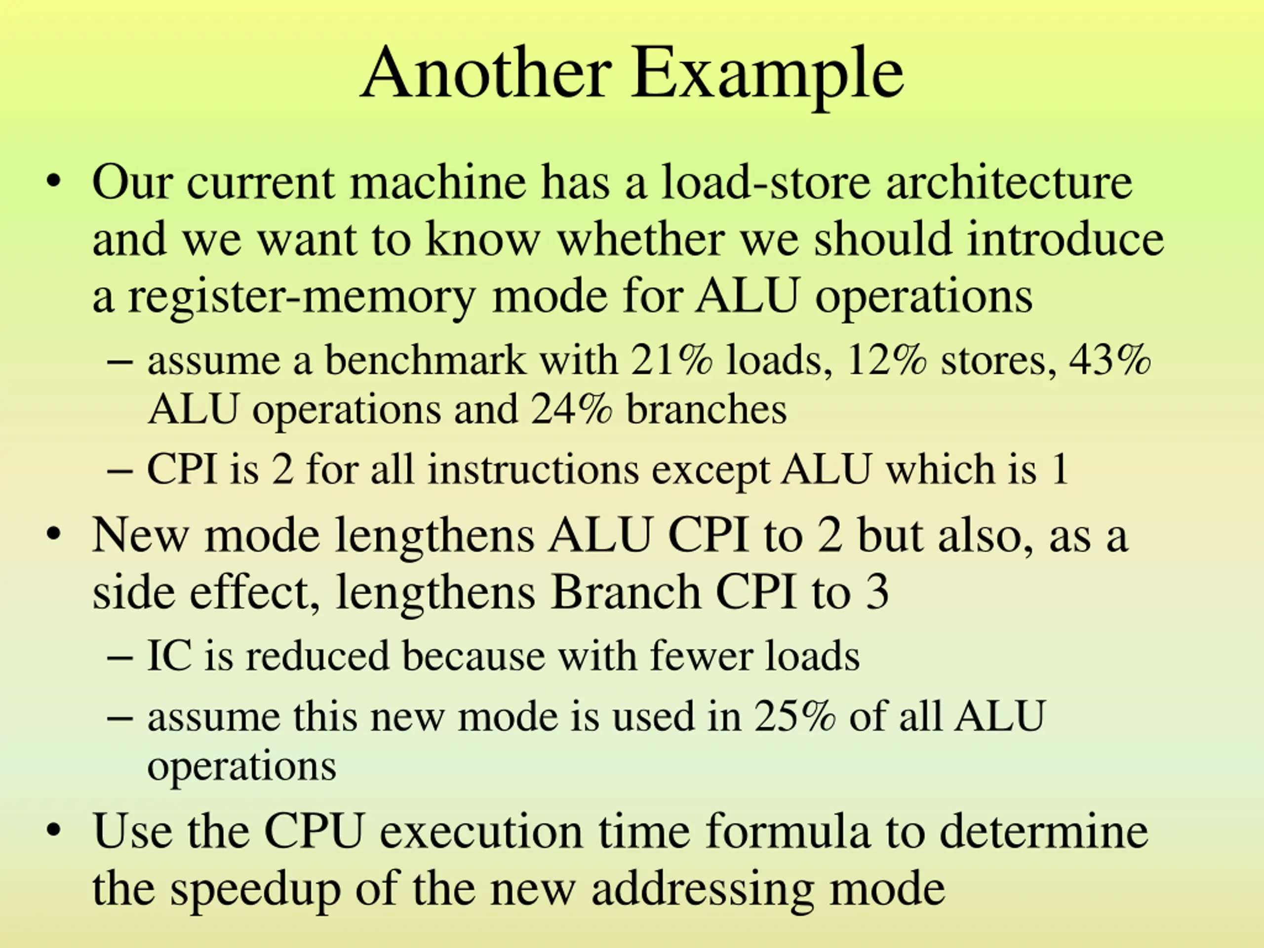 Another Example Our current machine has a load-store architecture and we want to know whether we should introduce a register-memory mode for ALU operations assume a benchmark with 21% loads, 12% stores, 43% ALU operations and 24% branches CPI is 2 for all instructions except ALU which is 1 New mode lengthens ALU CPI to 2 but also, as a side effect, lengthens Branch CPI to 3 IC is reduced because with fewer loads assume this new mode is used in 25% of all ALU operations Use the CPU execution time formula to determine the speedup of the new addressing mode