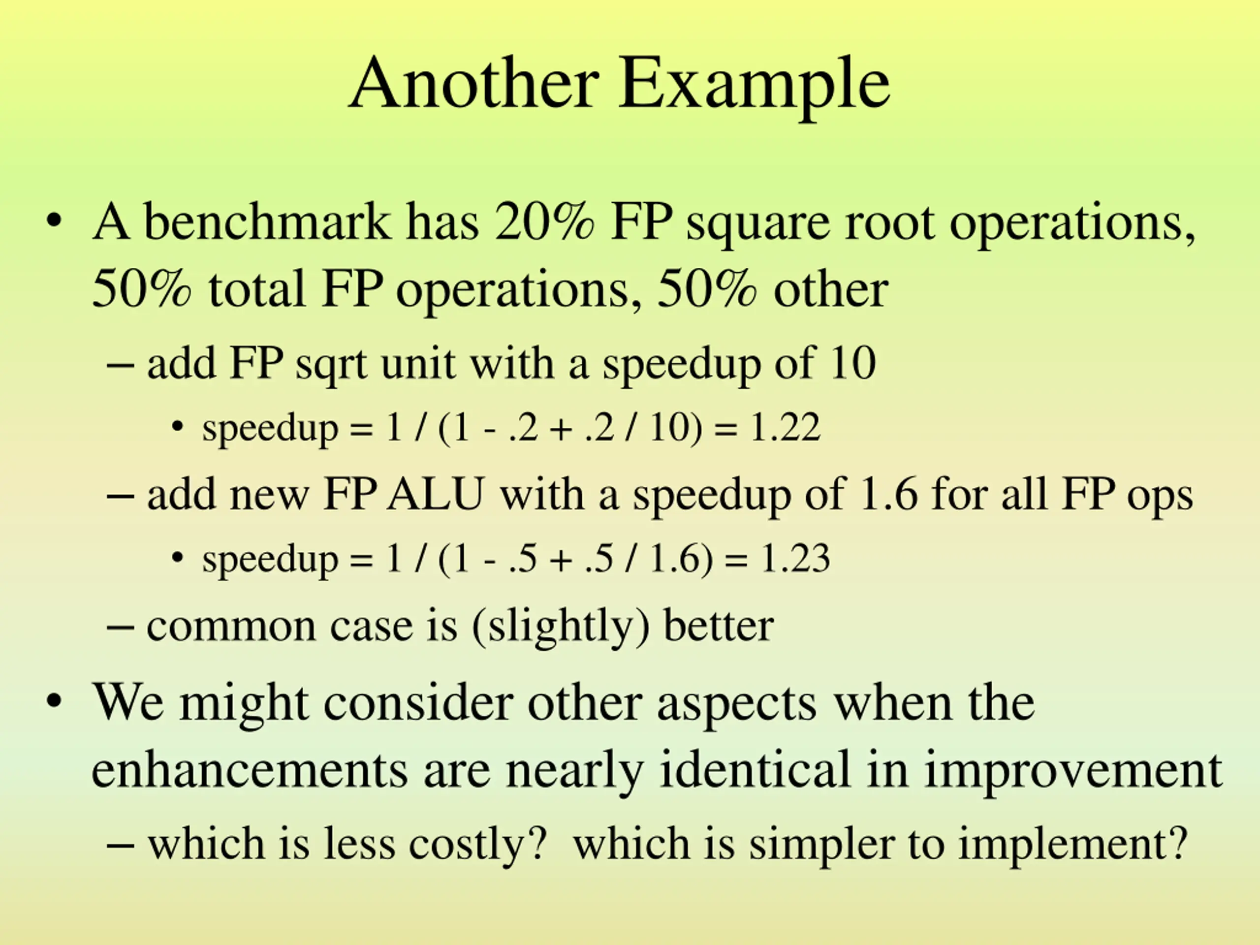 Another Example A benchmark has 20% FP square root operations, 50% total FP operations, 50% other add FP sqrt unit with a speedup of 10 speedup = 1 / (1 - .2 + .2 / 10) = 1.22 add new FP ALU with a speedup of 1.6 for all FP ops speedup = 1 / (1 - .5 + .5 / 1.6) = 1.23 common case is (slightly) better We might consider other aspects when the enhancements are nearly identical in improvement which is less costly? which is simpler to implement?
