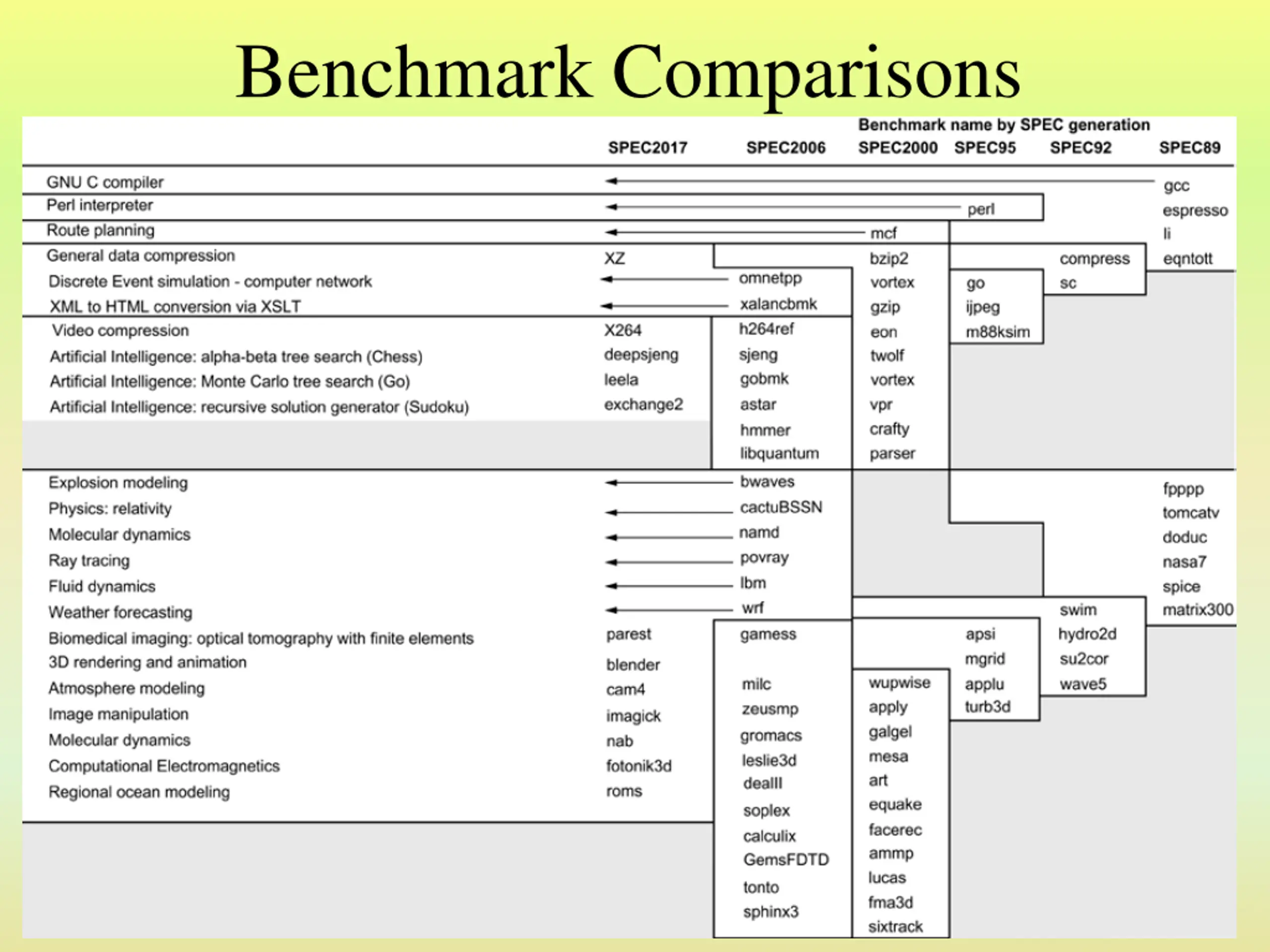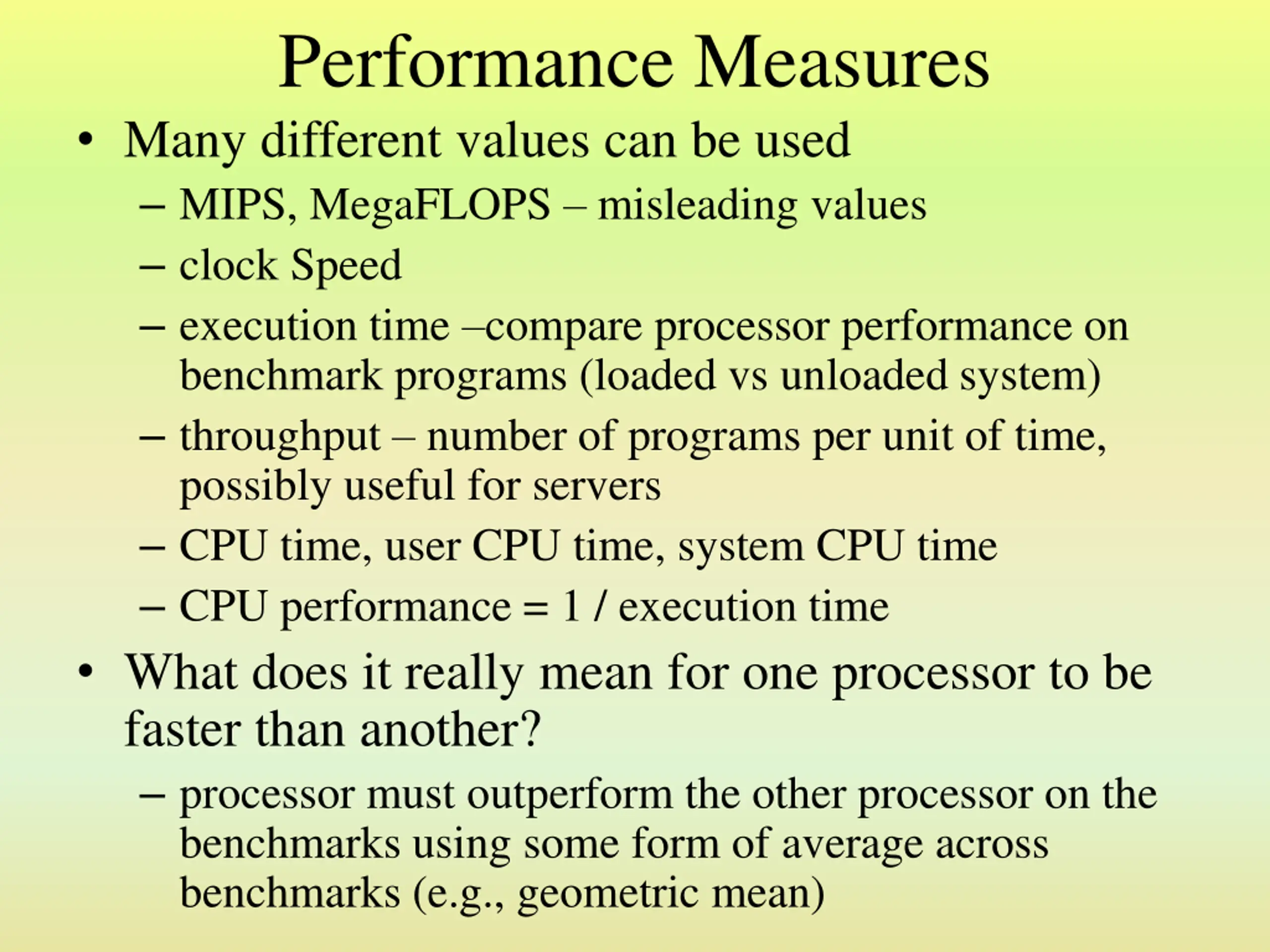 Performance Measures Many different values can be used MIPS, MegaFLOPS misleading values clock Speed execution time compare processor performance on benchmark programs (loaded vs unloaded system) throughput number of programs per unit of time, possibly useful for servers CPU time, user CPU time, system CPU time CPU performance = 1 / execution time What does it really mean for one processor to be faster than another? processor must outperform the other processor on the benchmarks using some form of average across benchmarks (e.g., geometric mean)