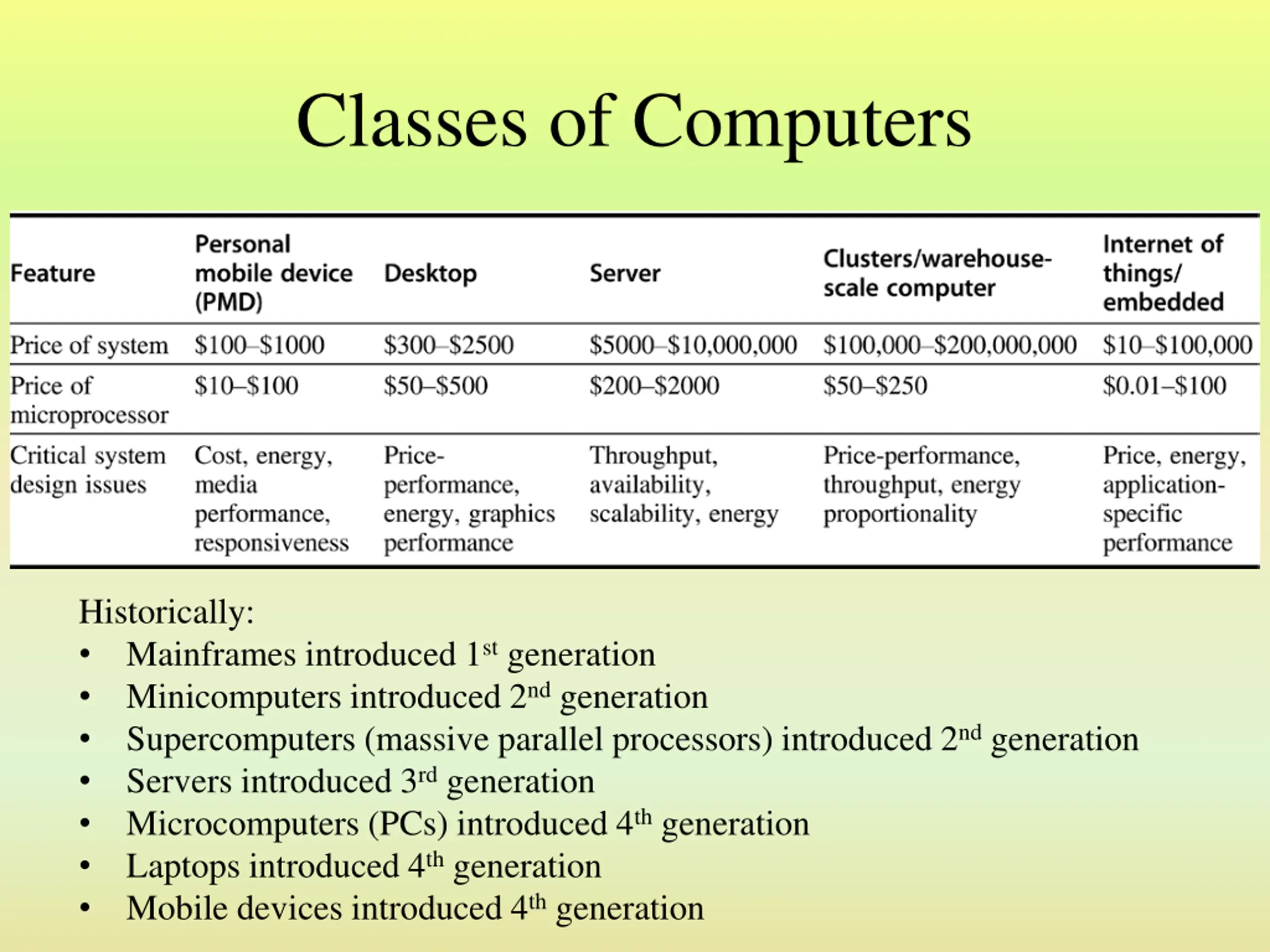 Classes of Computers Historically: Mainframes introduced 1st generation Minicomputers introduced 2nd generation Supercomputers (massive parallel processors) introduced 2nd generation Servers introduced 3rd generation Microcomputers (PCs) introduced 4th generation Laptops introduced 4th generation Mobile devices introduced 4th generation