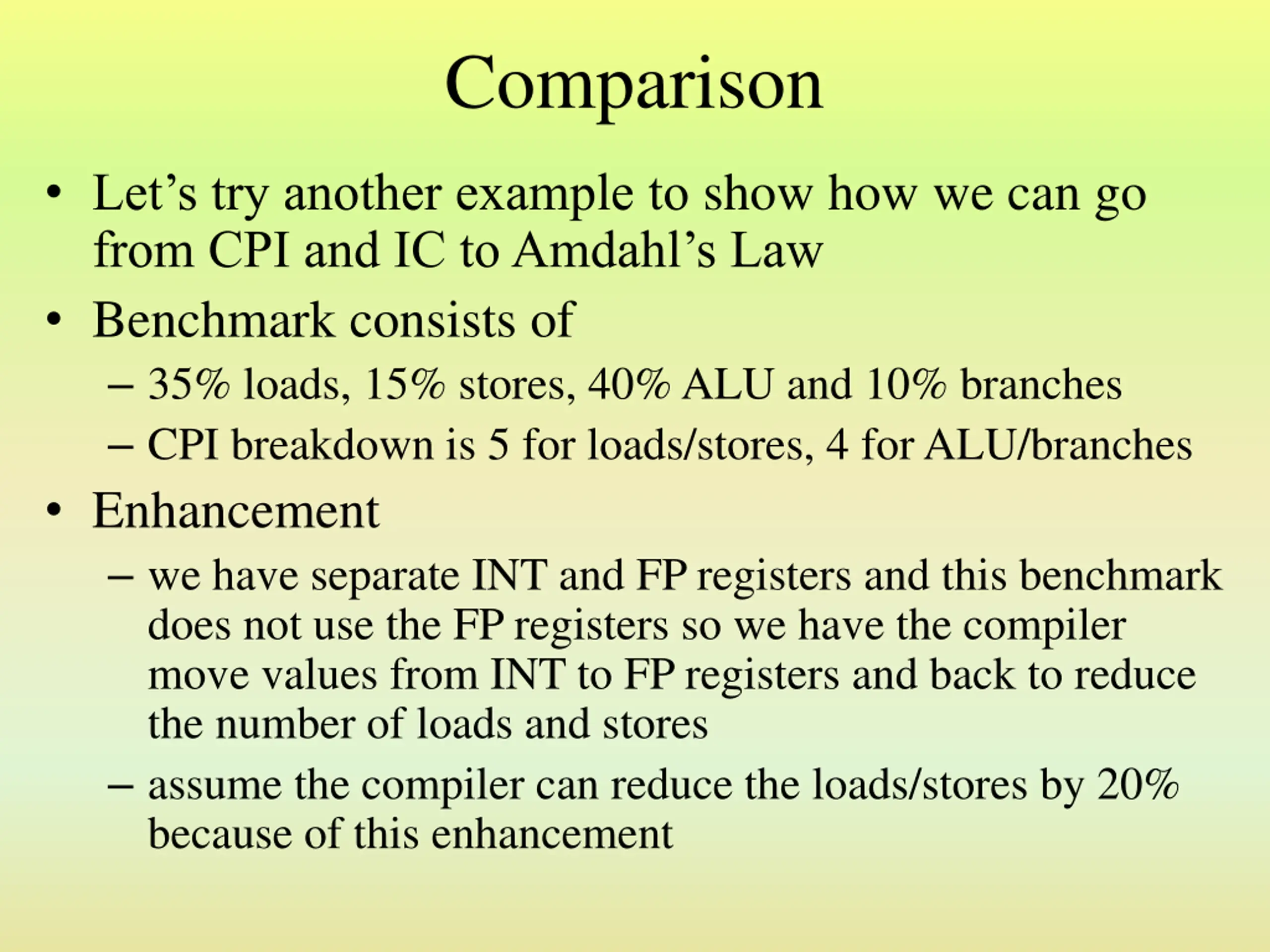 Comparison Let s try another example to show how we can go from CPI and IC to Amdahl s Law Benchmark consists of 35% loads, 15% stores, 40% ALU and 10% branches CPI breakdown is 5 for loads/stores, 4 for ALU/branches Enhancement we have separate INT and FP registers and this benchmark does not use the FP registers so we have the compiler move values from INT to FP registers and back to reduce the number of loads and stores assume the compiler can reduce the loads/stores by 20% because of this enhancement