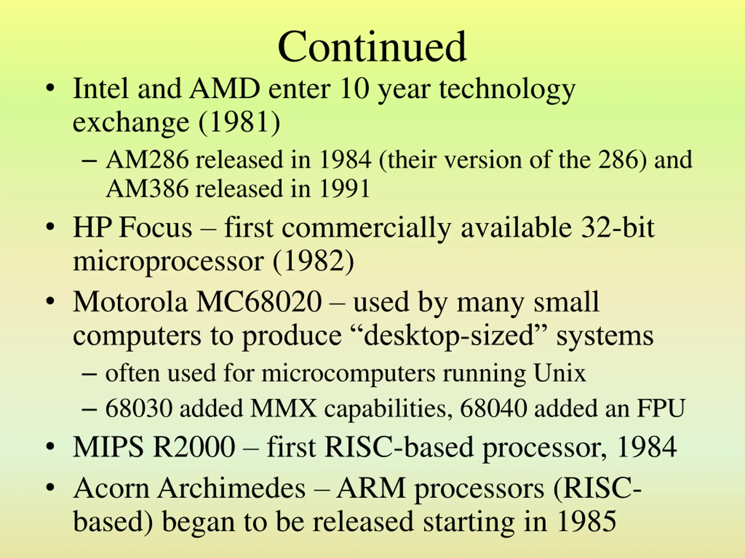 Continued Intel and AMD enter 10 year technology exchange (1981) AM286 released in 1984 (their version of the 286) and AM386 released in 1991 HP Focus first commercially available 32-bit microprocessor (1982) Motorola MC68020 used by many small computers to produce desktop-sized systems often used for microcomputers running Unix 68030 added MMX capabilities, 68040 added an FPU MIPS R2000 first RISC-based processor, 1984 Acorn Archimedes ARM processors (RISC- based) began to be released starting in 1985