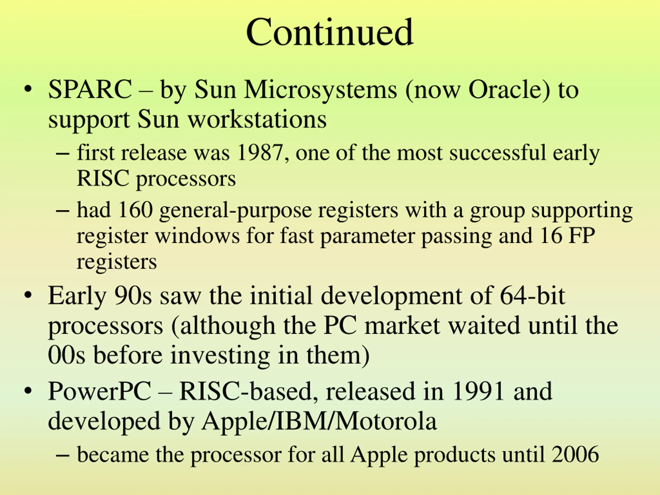 Continued SPARC by Sun Microsystems (now Oracle) to support Sun workstations first release was 1987, one of the most successful early RISC processors had 160 general-purpose registers with a group supporting register windows for fast parameter passing and 16 FP registers Early 90s saw the initial development of 64-bit processors (although the PC market waited until the 00s before investing in them) PowerPC RISC-based, released in 1991 and developed by Apple/IBM/Motorola became the processor for all Apple products until 2006