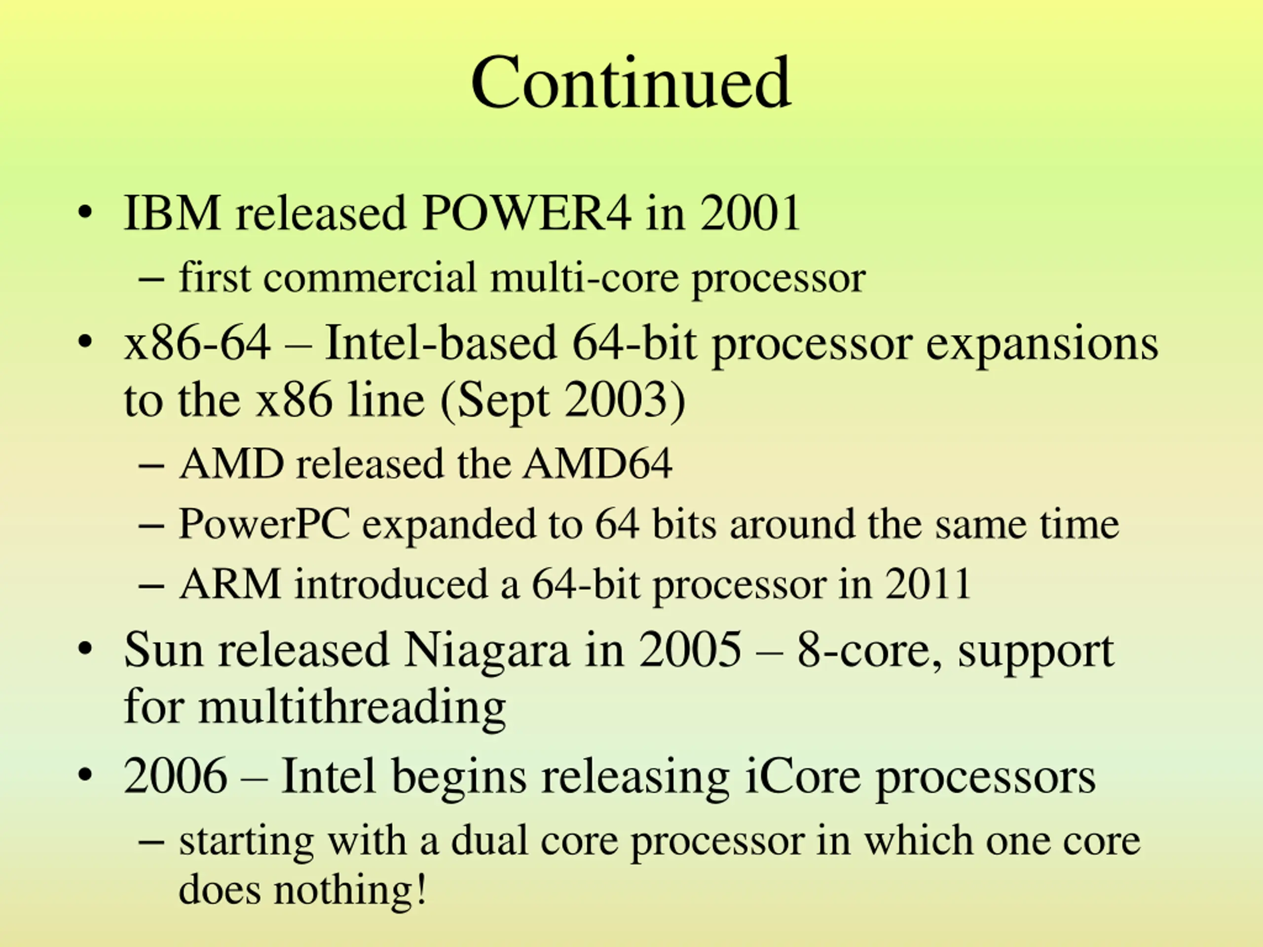 Continued IBM released POWER4 in 2001 first commercial multi-core processor x86-64 Intel-based 64-bit processor expansions to the x86 line (Sept 2003) AMD released the AMD64 PowerPC expanded to 64 bits around the same time ARM introduced a 64-bit processor in 2011 Sun released Niagara in 2005 8-core, support for multithreading 2006 Intel begins releasing iCore processors starting with a dual core processor in which one core does nothing!