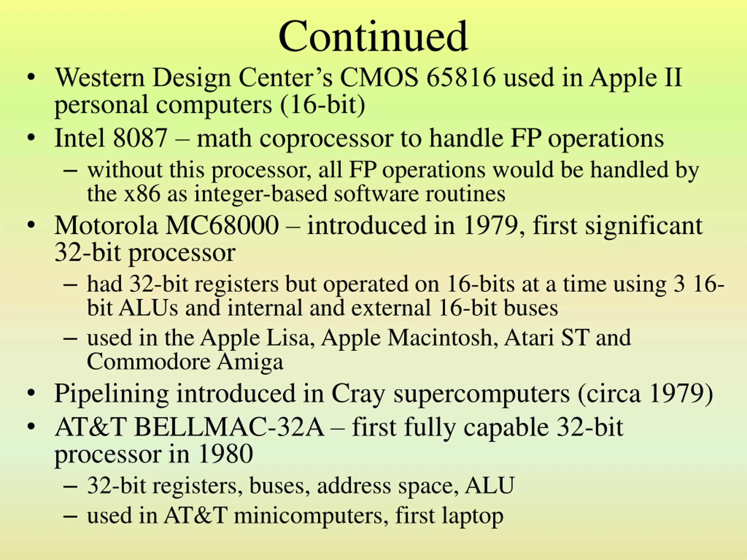 Continued Western Design Center s CMOS 65816 used in Apple II personal computers (16-bit) Intel 8087 math coprocessor to handle FP operations without this processor, all FP operations would be handled by the x86 as integer-based software routines Motorola MC68000 introduced in 1979, first significant 32-bit processor had 32-bit registers but operated on 16-bits at a time using 3 16- bit ALUs and internal and external 16-bit buses used in the Apple Lisa, Apple Macintosh, Atari ST and Commodore Amiga Pipelining introduced in Cray supercomputers (circa 1979) AT&T BELLMAC-32A first fully capable 32-bit processor in 1980 32-bit registers, buses, address space, ALU used in AT&T minicomputers, first laptop