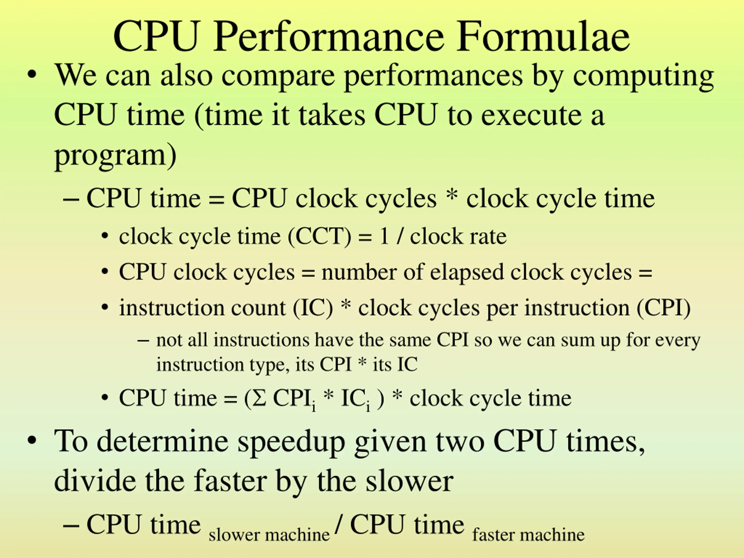 CPU Performance Formulae We can also compare performances by computing CPU time (time it takes CPU to execute a program) CPU time = CPU clock cycles * clock cycle time clock cycle time (CCT) = 1 / clock rate CPU clock cycles = number of elapsed clock cycles = instruction count (IC) * clock cycles per instruction (CPI) not all instructions have the same CPI so we can sum up for every instruction type, its CPI * its IC CPU time = ( CPIi * ICi ) * clock cycle time To determine speedup given two CPU times, divide the faster by the slower CPU time slower machine / CPU time faster machine
