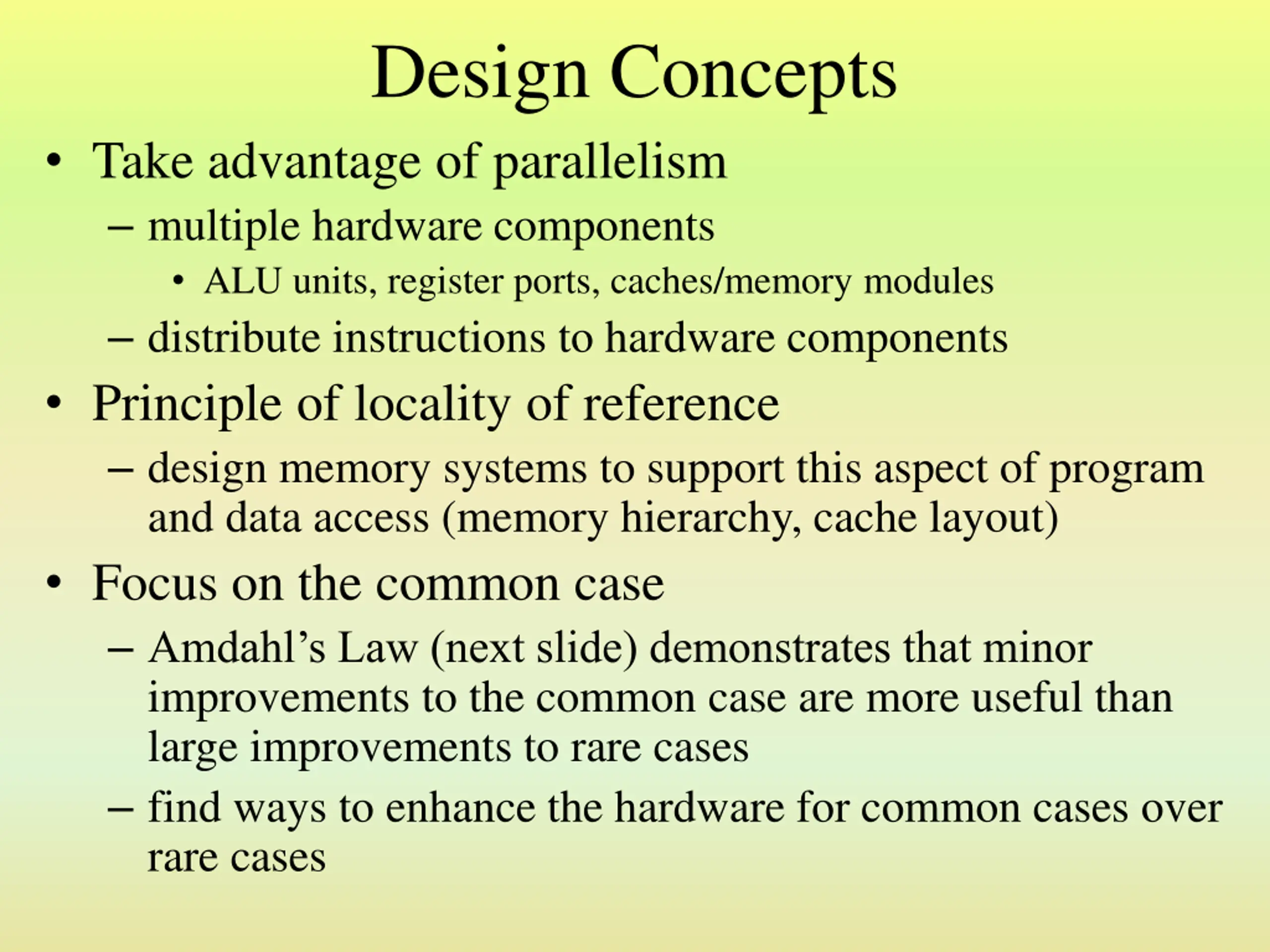 Design Concepts Take advantage of parallelism multiple hardware components ALU units, register ports, caches/memory modules distribute instructions to hardware components Principle of locality of reference design memory systems to support this aspect of program and data access (memory hierarchy, cache layout) Focus on the common case Amdahl s Law (next slide) demonstrates that minor improvements to the common case are more useful than large improvements to rare cases find ways to enhance the hardware for common cases over rare cases