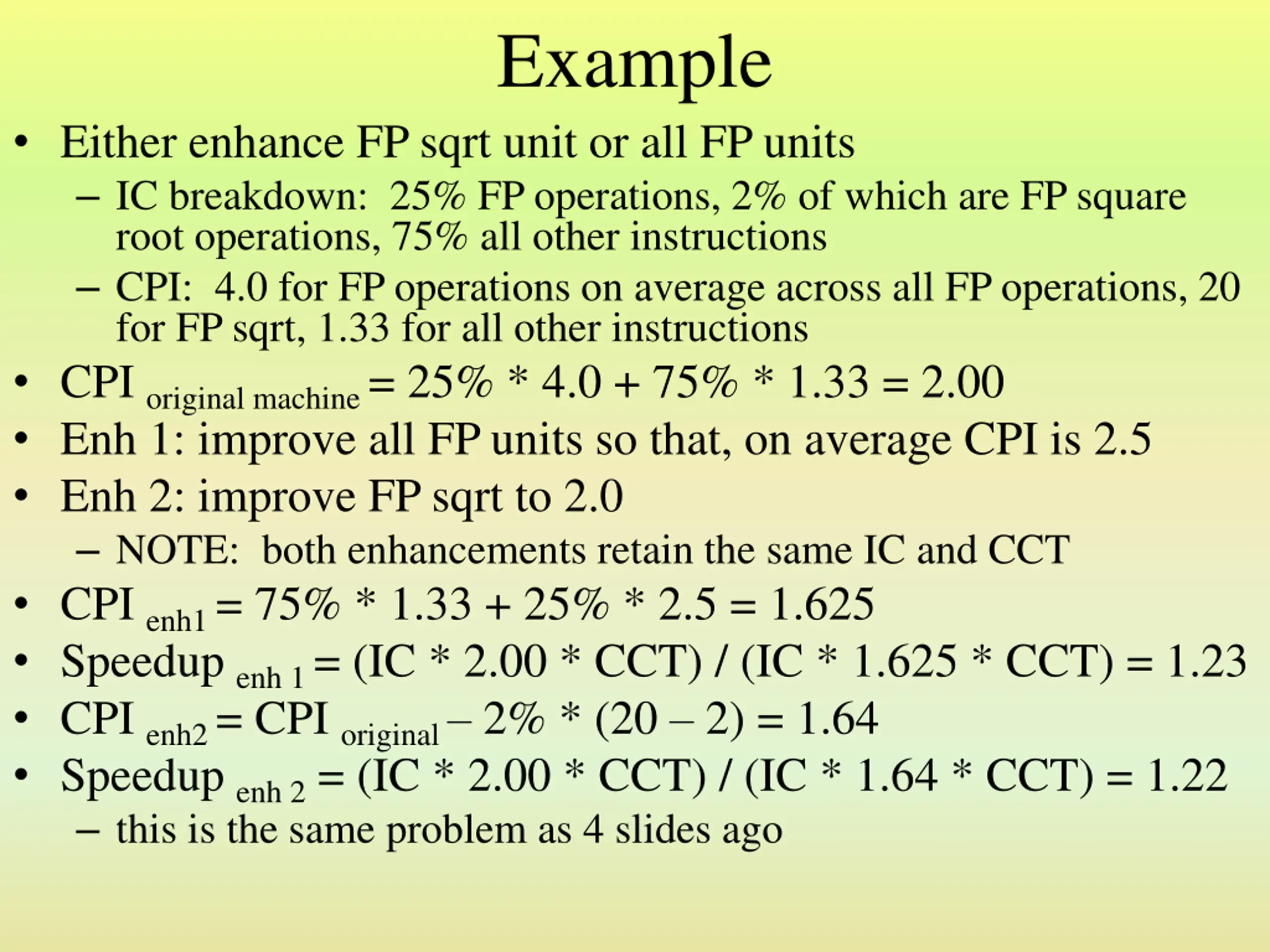 Example Either enhance FP sqrt unit or all FP units IC breakdown: 25% FP operations, 2% of which are FP square root operations, 75% all other instructions CPI: 4.0 for FP operations on average across all FP operations, 20 for FP sqrt, 1.33 for all other instructions CPI original machine = 25% * 4.0 + 75% * 1.33 = 2.00 Enh 1: improve all FP units so that, on average CPI is 2.5 Enh 2: improve FP sqrt to 2.0 NOTE: both enhancements retain the same IC and CCT CPI enh1 = 75% * 1.33 + 25% * 2.5 = 1.625 Speedup enh 1 = (IC * 2.00 * CCT) / (IC * 1.625 * CCT) = 1.23 CPI enh2 = CPI original 2% * (20 2) = 1.64 Speedup enh 2 = (IC * 2.00 * CCT) / (IC * 1.64 * CCT) = 1.22 this is the same problem as 4 slides ago
