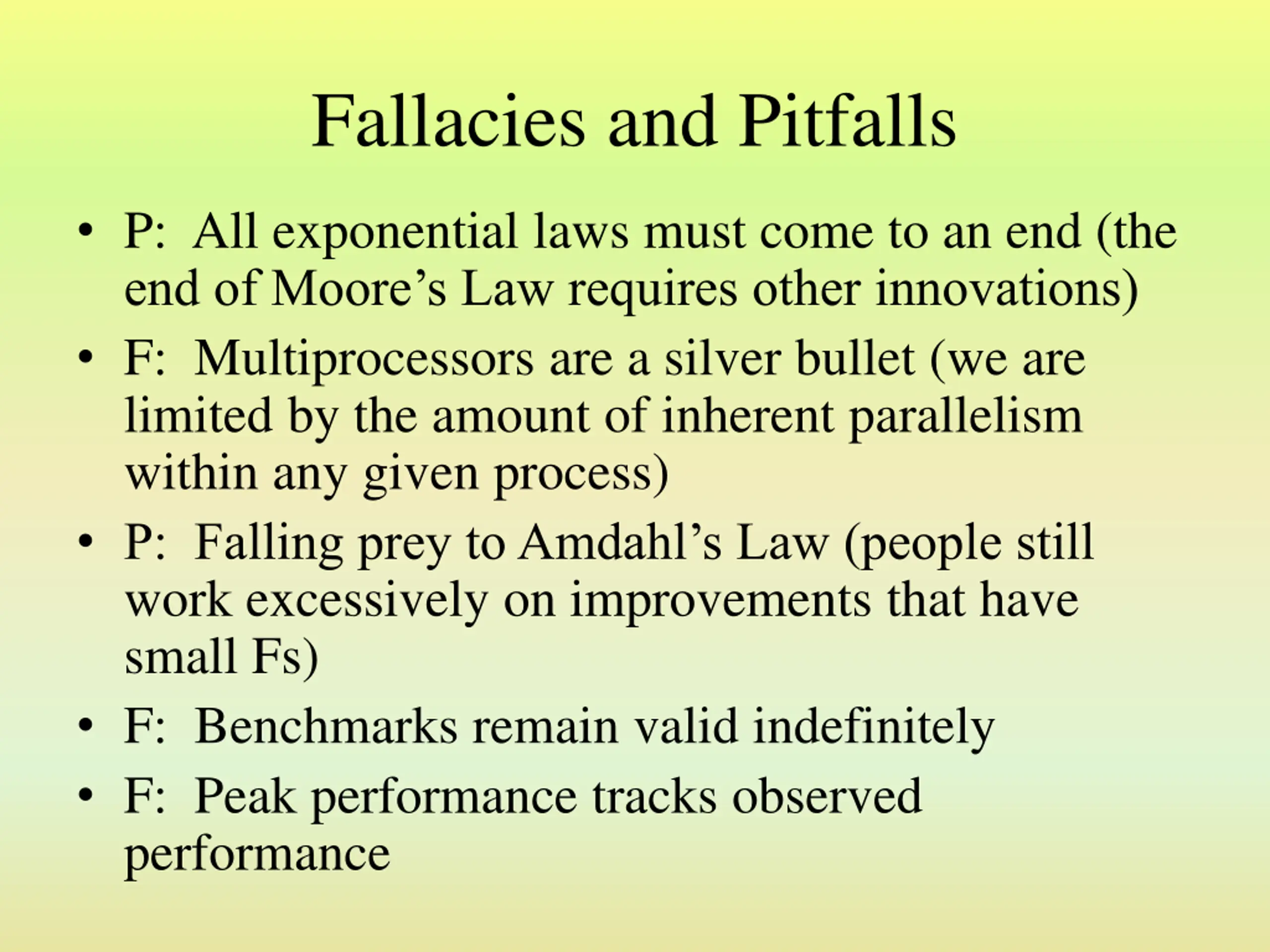 Fallacies and Pitfalls P: All exponential laws must come to an end (the end of Moore s Law requires other innovations) F: Multiprocessors are a silver bullet (we are limited by the amount of inherent parallelism within any given process) P: Falling prey to Amdahl s Law (people still work excessively on improvements that have small Fs) F: Benchmarks remain valid indefinitely F: Peak performance tracks observed performance