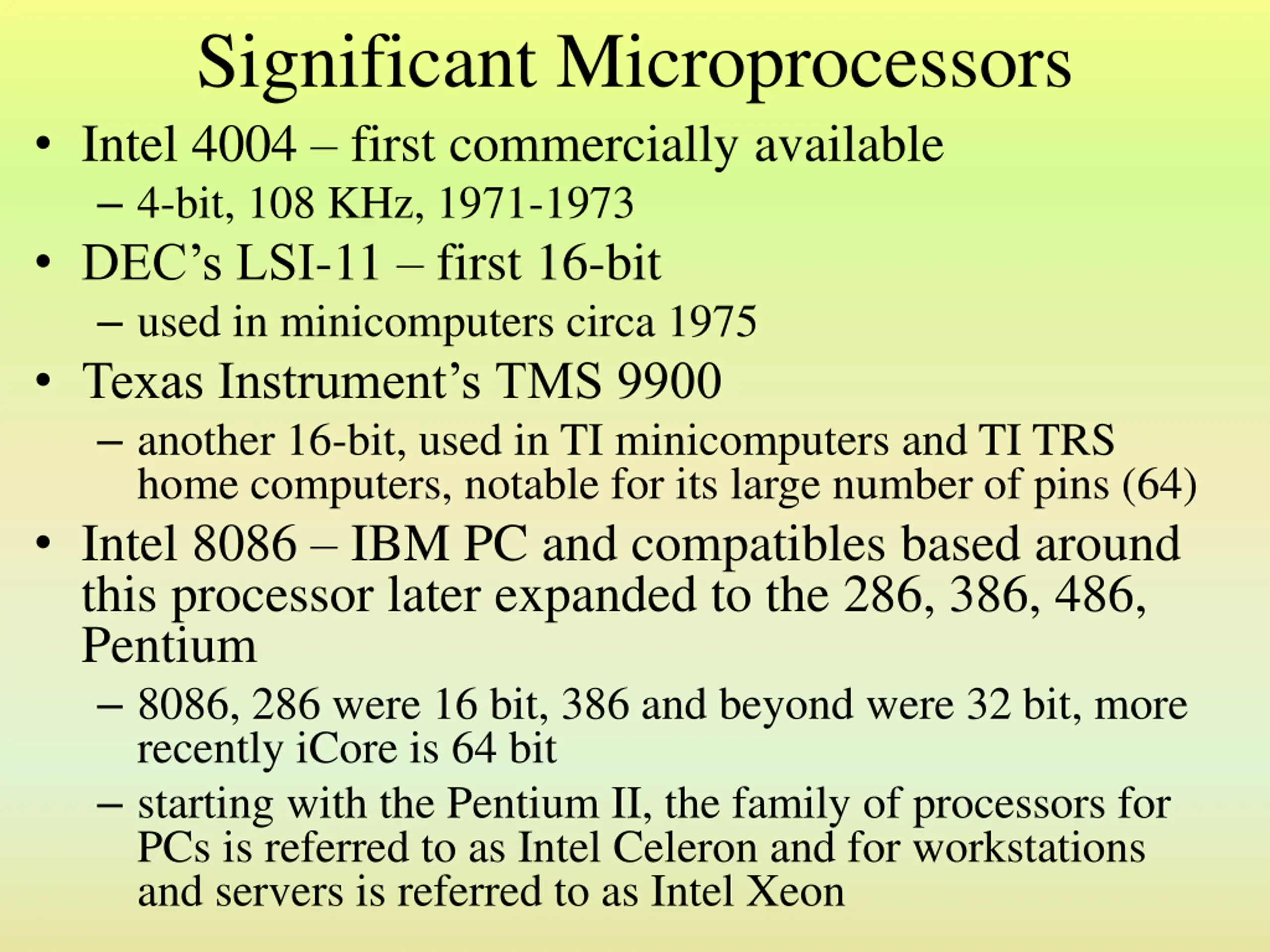 Significant Microprocessors Intel 4004 first commercially available 4-bit, 108 KHz, 1971-1973 DEC s LSI-11 first 16-bit used in minicomputers circa 1975 Texas Instrument s TMS 9900 another 16-bit, used in TI minicomputers and TI TRS home computers, notable for its large number of pins (64) Intel 8086 IBM PC and compatibles based around this processor later expanded to the 286, 386, 486, Pentium 8086, 286 were 16 bit, 386 and beyond were 32 bit, more recently iCore is 64 bit starting with the Pentium II, the family of processors for PCs is referred to as Intel Celeron and for workstations and servers is referred to as Intel Xeon