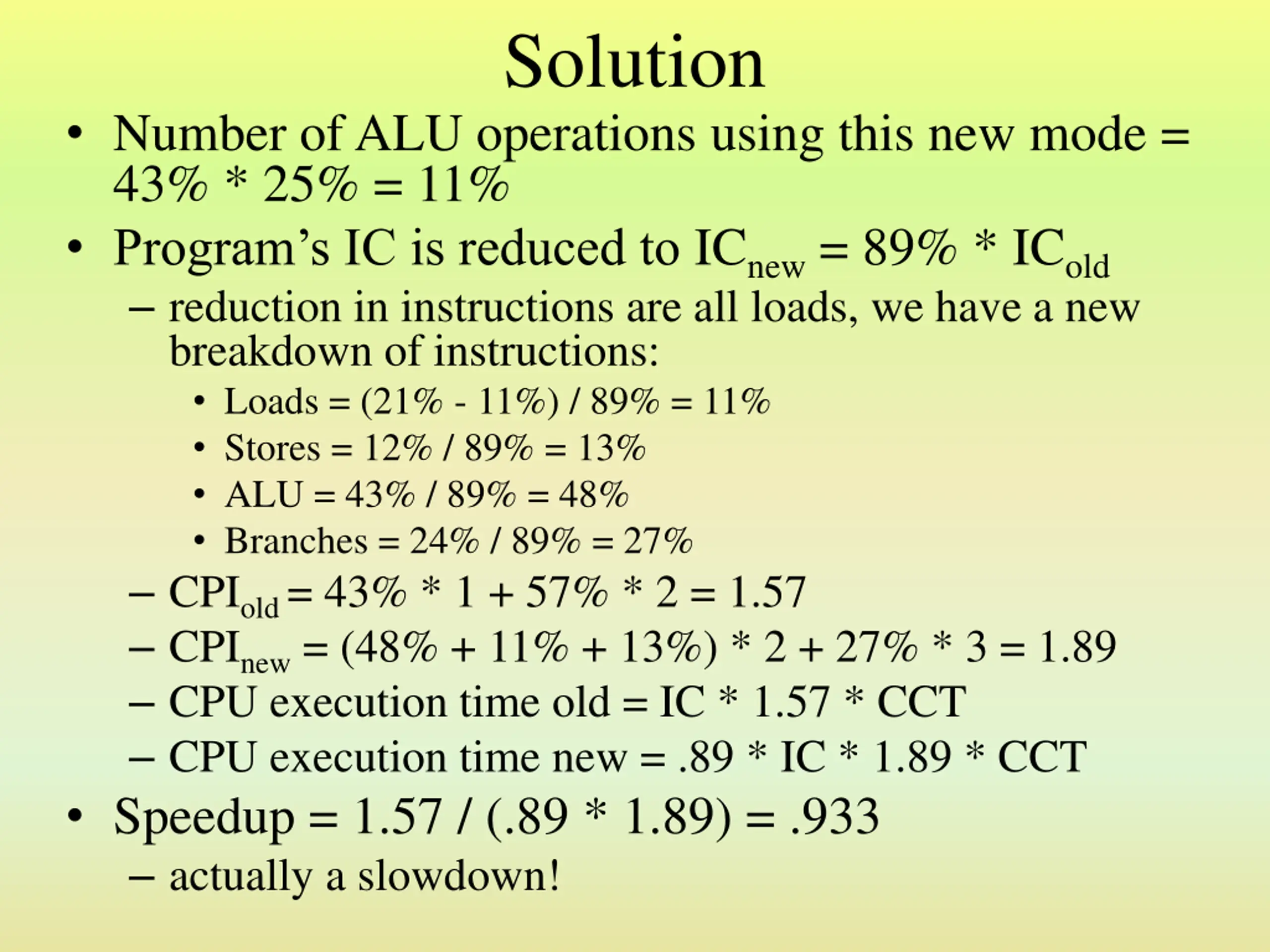 Solution Number of ALU operations using this new mode = 43% * 25% = 11% Program s IC is reduced to ICnew = 89% * ICold reduction in instructions are all loads, we have a new breakdown of instructions: Loads = (21% - 11%) / 89% = 11% Stores = 12% / 89% = 13% ALU = 43% / 89% = 48% Branches = 24% / 89% = 27% CPIold = 43% * 1 + 57% * 2 = 1.57 CPInew = (48% + 11% + 13%) * 2 + 27% * 3 = 1.89 CPU execution time old = IC * 1.57 * CCT CPU execution time new = .89 * IC * 1.89 * CCT Speedup = 1.57 / (.89 * 1.89) = .933 actually a slowdown!